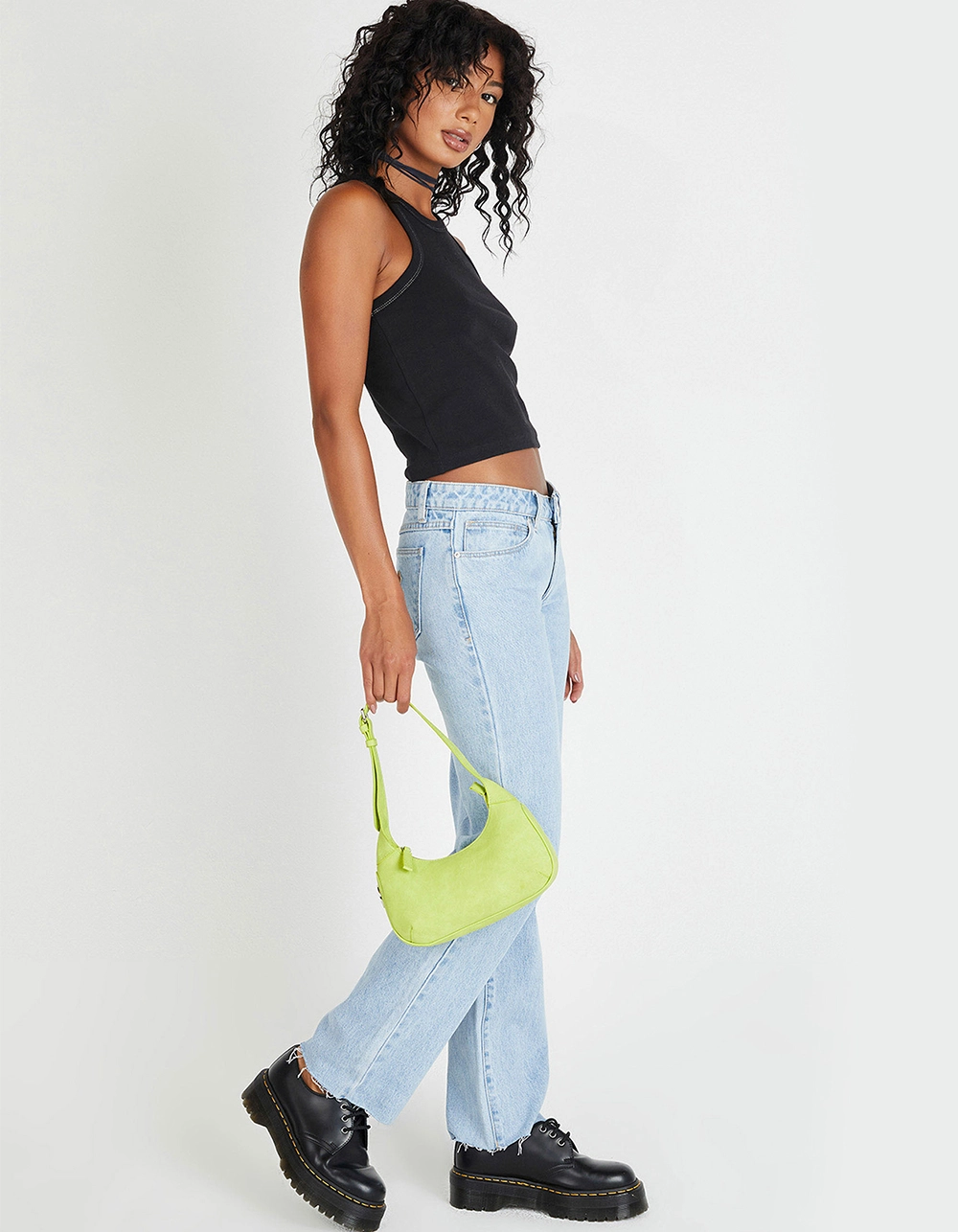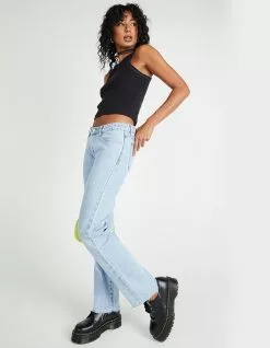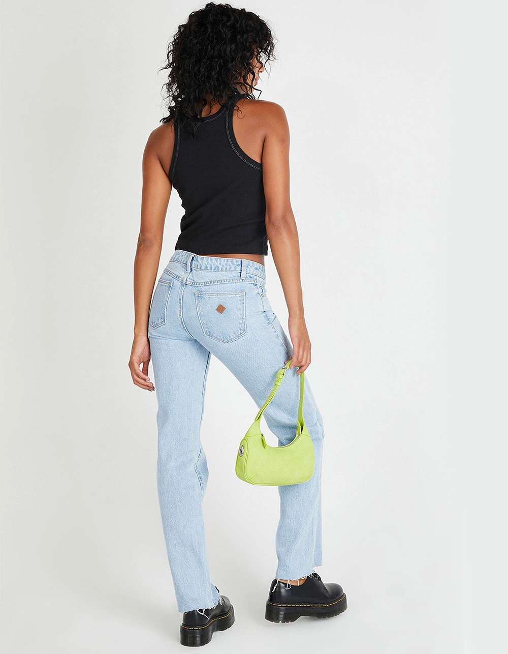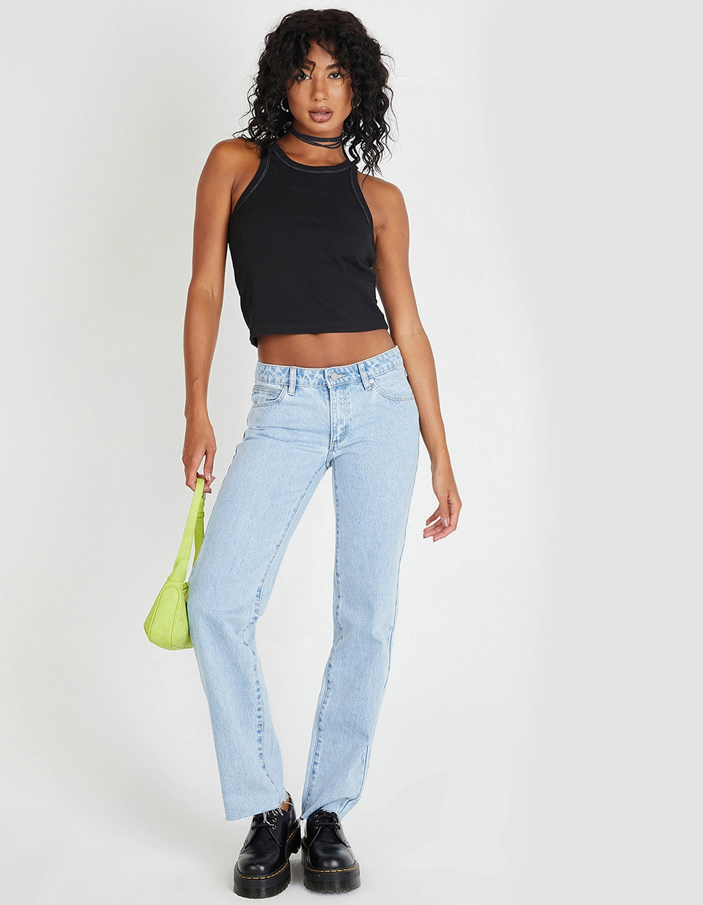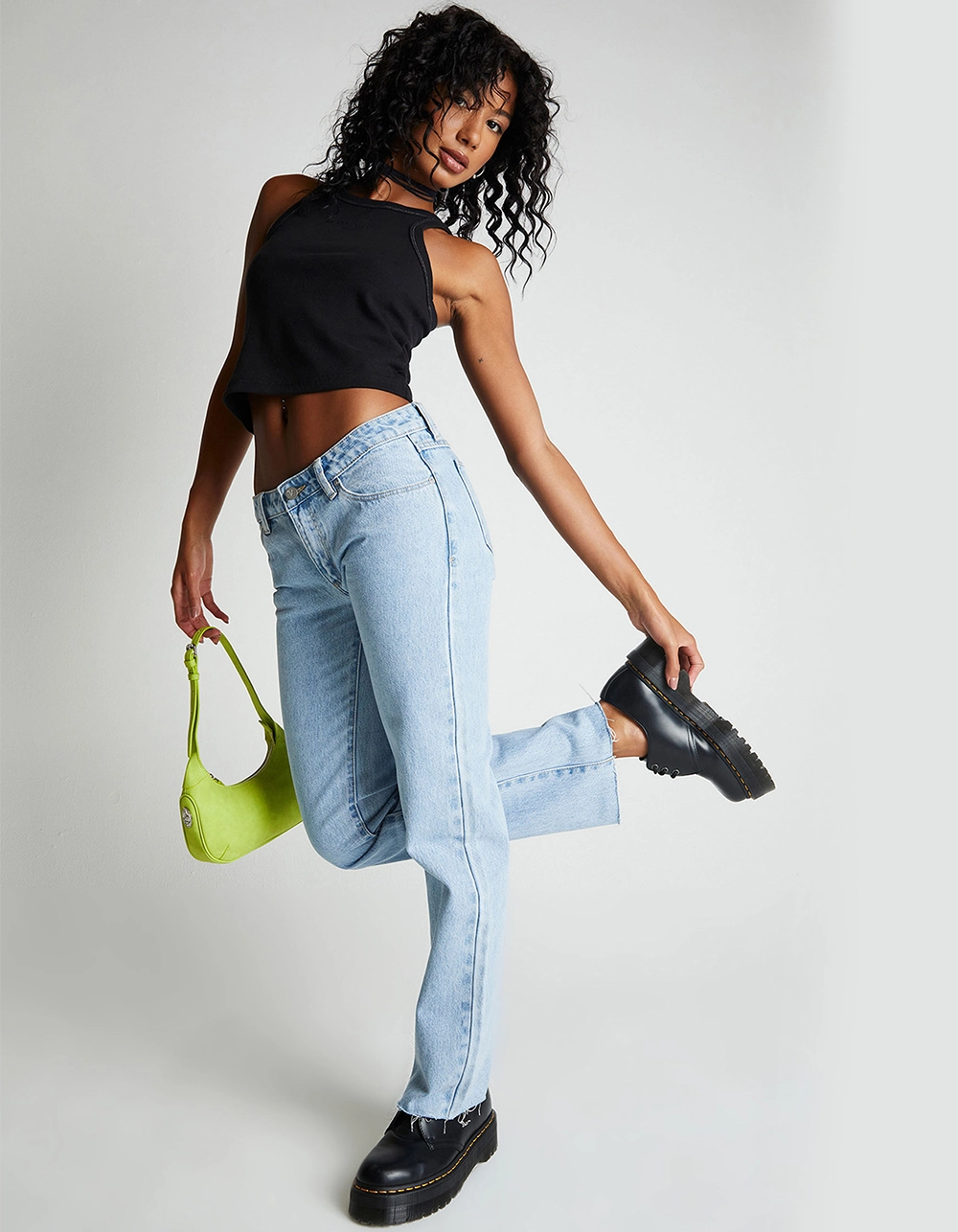 Abrand 99 Low Straight Jeans. Zip fly and button closure. Low waisted. Traditional five pocket styling. Straight leg. Raw edge hem. Light wash. Approx. inseam: 31”. 100% Cotton. Machine wash. Imported.