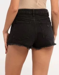 Abrand Jeans A High Relaxed Denim Shorts. Relaxed fit denim shorts. High button front waist with zipper fly. Classic 5 pocket design. Destructed detailing. Frayed hem. Leather patch at back pocket. Approx. inseam: 2″. 100% cotton. Machine wash. Imported.
