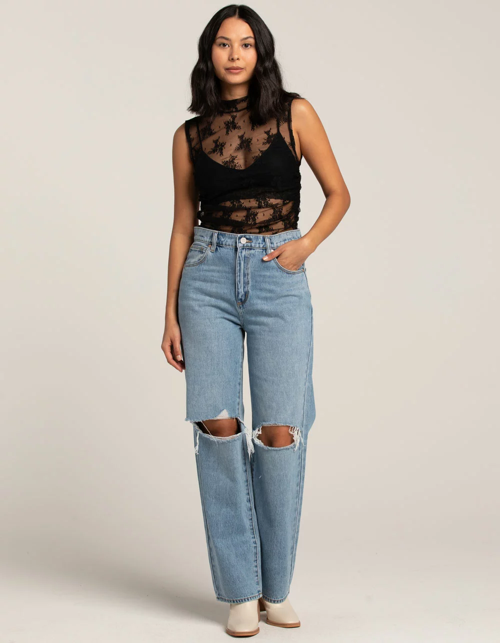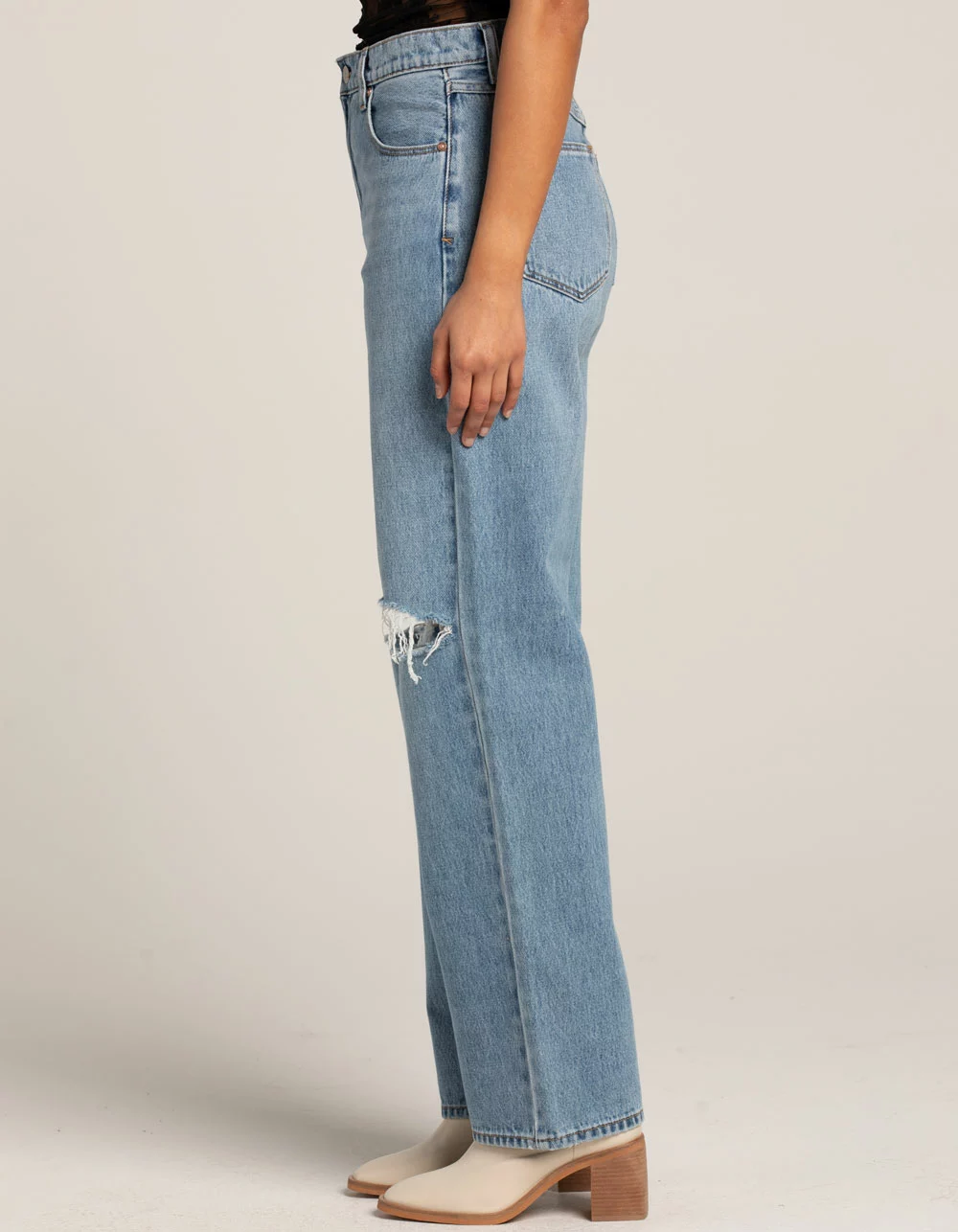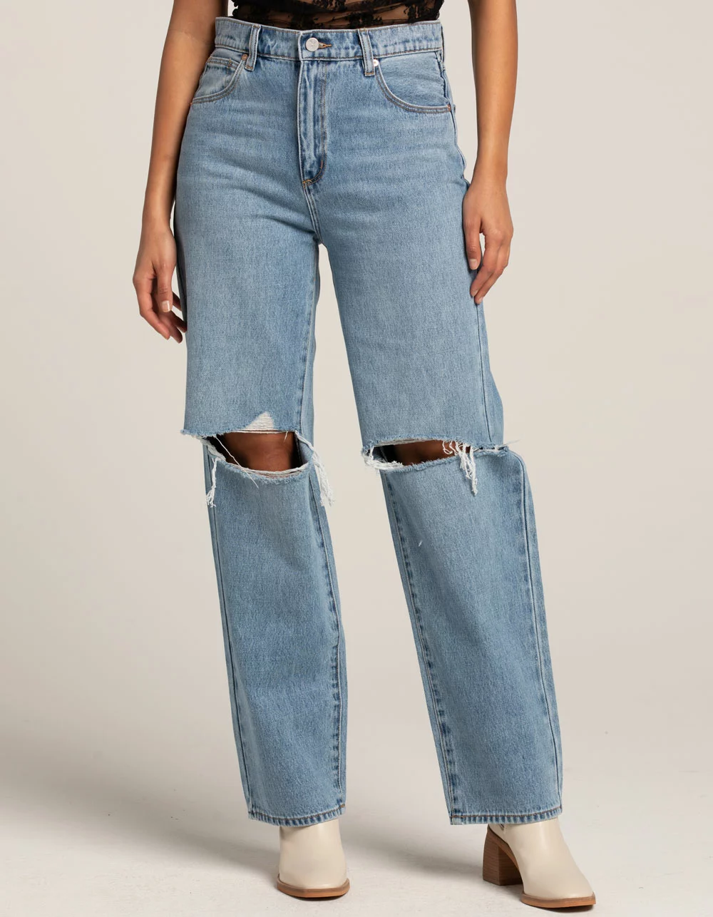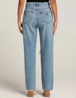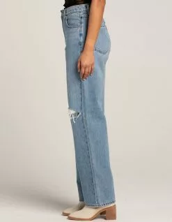 Abrand Slouch Harley Rip Jeans. Zip fly and button closure. Belt loop waist. Traditional five pocket styling. Rips at knees. High rise. Straight leg, loose fit. Approx. inseam: 31”. 100% Cotton. Machine wash. Imported.