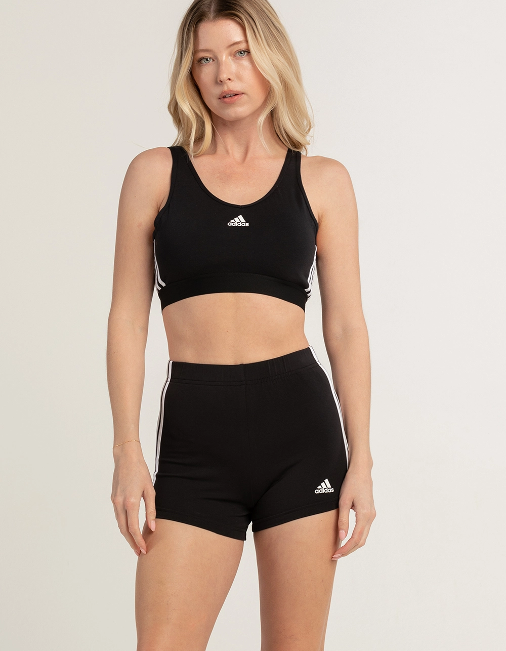 Adidas 3-Stripe Booty Shorts. Classic 3 stripes on pantlegs. Adidas logo on lower left pantleg. Elastic waistband. Approx. inseam: 3.25”. 90% Cotton, 10% Spandex. Machine wash. Imported.
