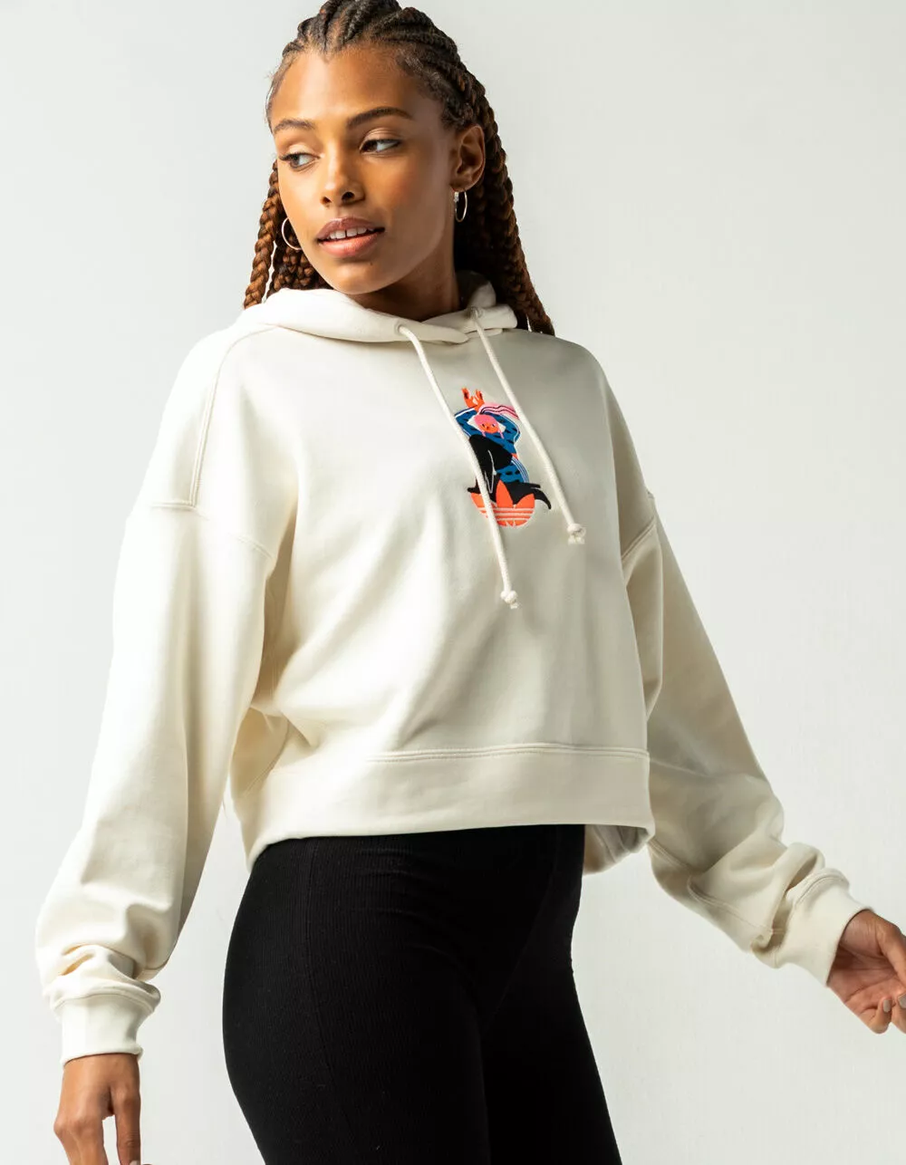 Adidas Adicolor Essentials x Egle No-Dye Organic Hoodie. The best way to feel good in what you’re wearing? Wear something that actually FEELS good. This hoodie is made with soft organic cotton that settles you right into comfort. In collaboration with adidas, London-based artist Egle brings her bright, punchy work to the look. Just a quick pop of personality is all you need. This product is made with organic cotton and is part of our ambition to end plastic waste. Loose fit. Drawcord-adjustable hood. Drop shoulders. Ribbed cuffs and hem. Semi cropped fit. Product is colored using a more sustainable technology. 100% organic cotton French terry. Machine wash. Imported.
