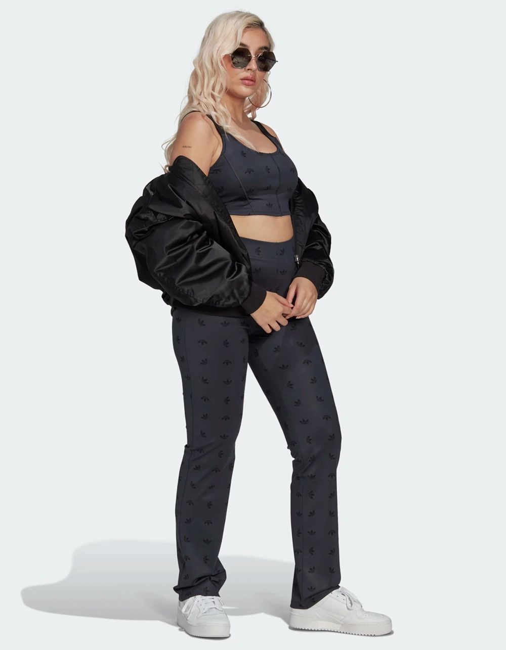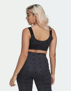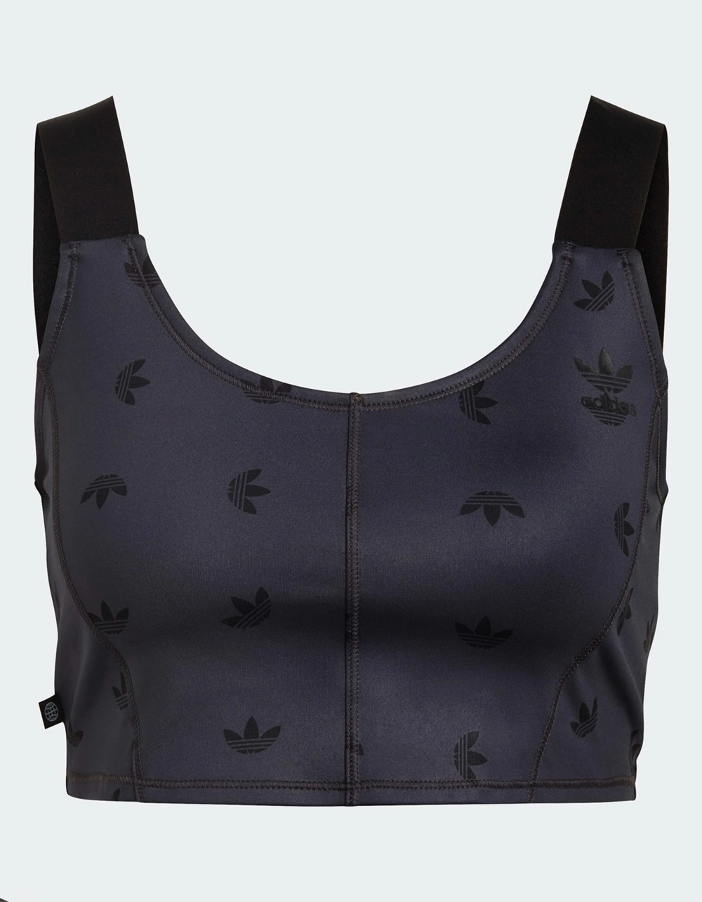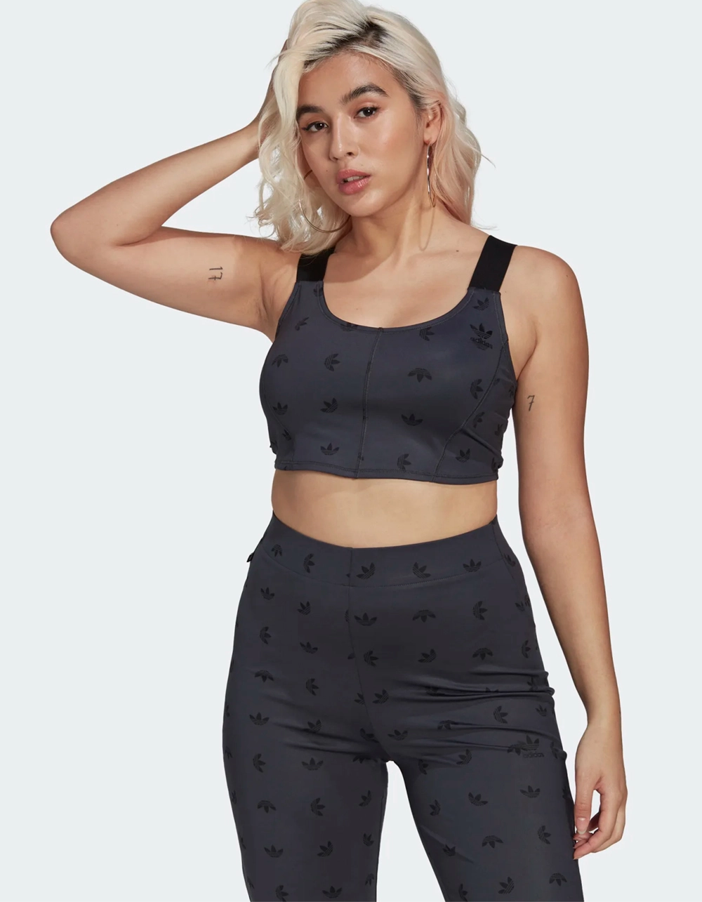 Adidas Allover Print Corset Womens Top. The symmetrical lines of corset design inspired this adidas top, the perfect pick for loungewear that looks just as good out as it does at home. With a luxe Trefoil monogram print, it pairs well with a blazer or a button-up shirt, and the swooping scoop neck gives you options for layering jewelry. Stretchy interlock fabric blends durability with comfort. Tight fit. Scoop neck. 79% recycled polyester, 21% elastane interlock. Imported.