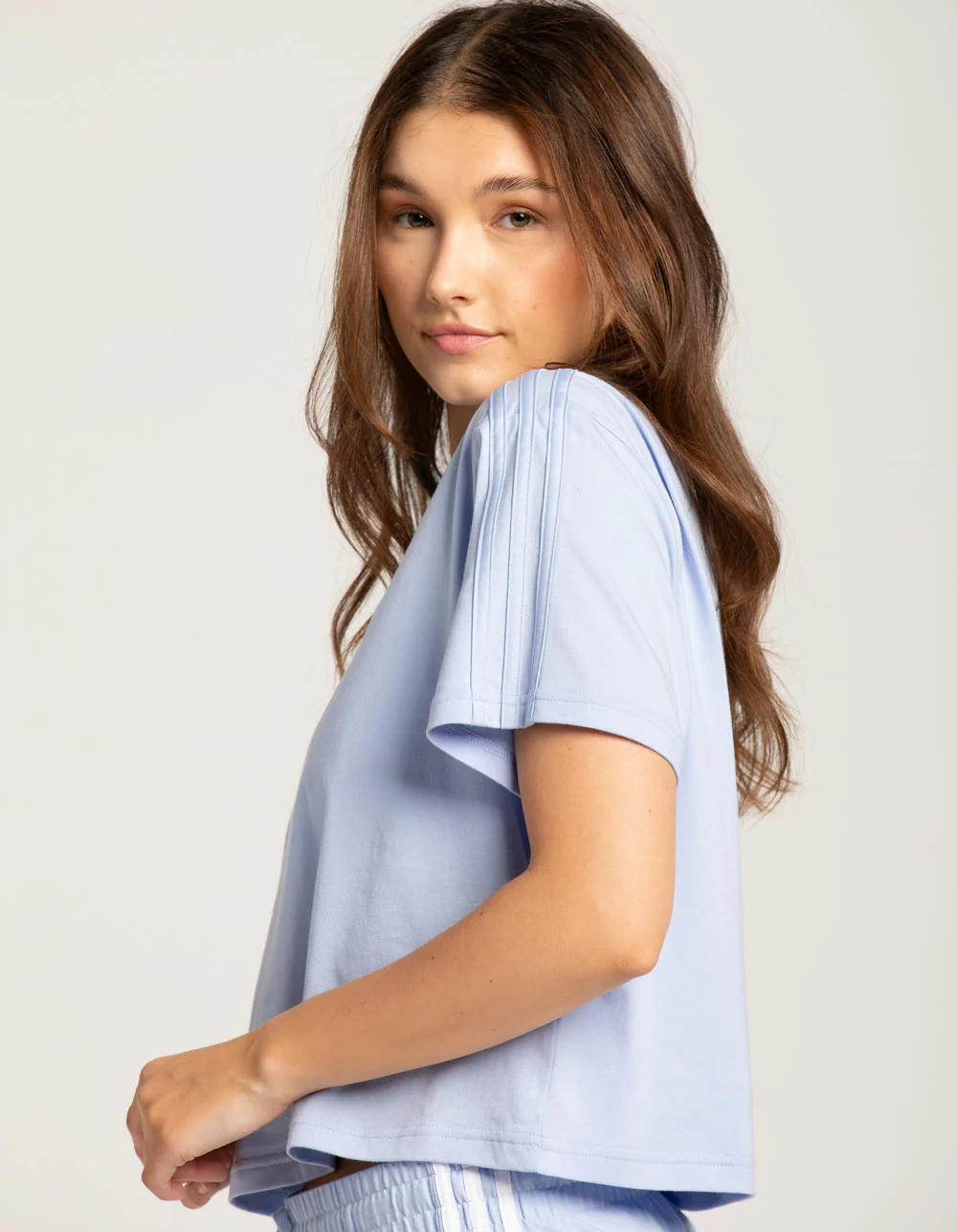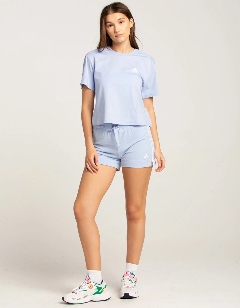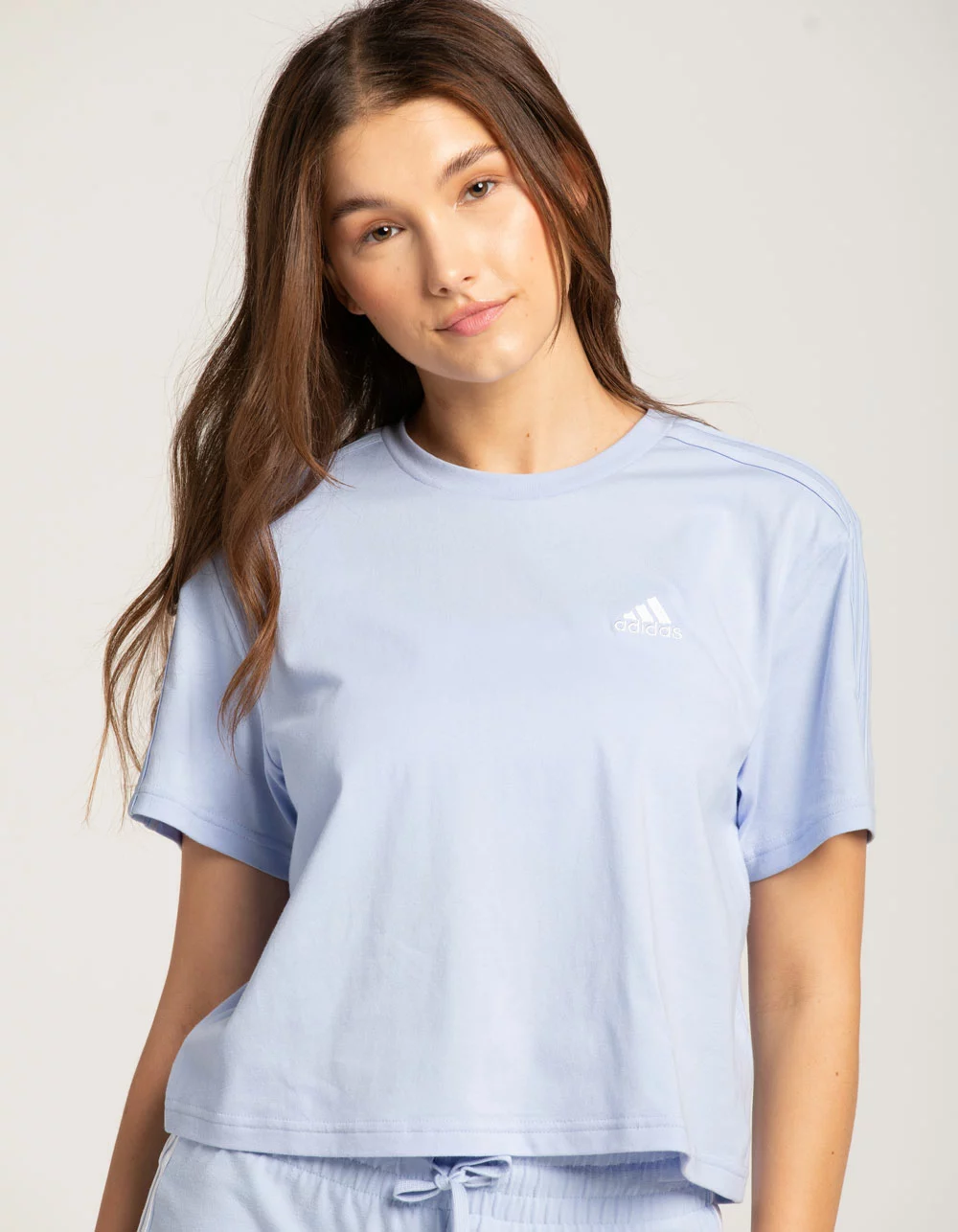 adidas Essential 3-Stripe Crop Tee. adidas logo embroidered on left chest. Crewneck. Short sleeves featuring 3-stripe detailing. Boxy and cropped fit. 100% Cotton. Machine wash. Imported.