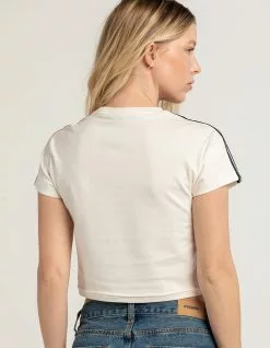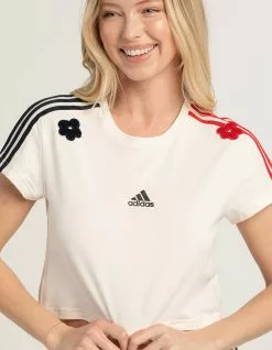 Adidas Flower Crop Tee. Adidas logo screen printed on center chest. Ribbed crew neckline. Classic 3 stripes on sleeves. Flower patch on each shoulder. Cropped fit. 93% Cotton, 7% Spandex. Machine wash. Imported.