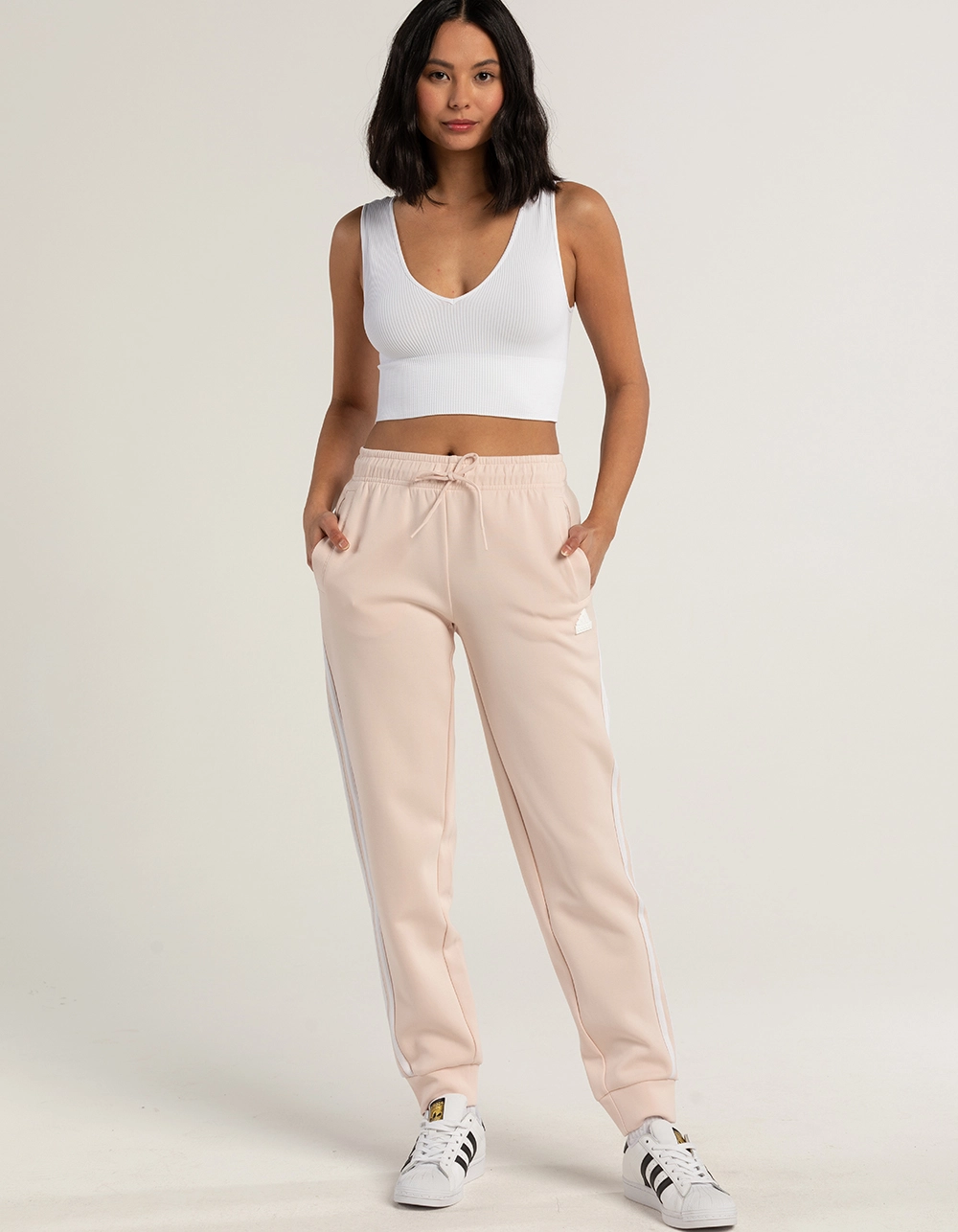 Adidas Future Icon Sweatpants. Elastic waistband with drawstring. Welt pockets. Adidas logo on left pant leg. Classic 3 stripes down the length of the pantlegs. 74% Cotton, 26% Polyester. Machine wash. Imported.