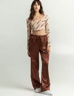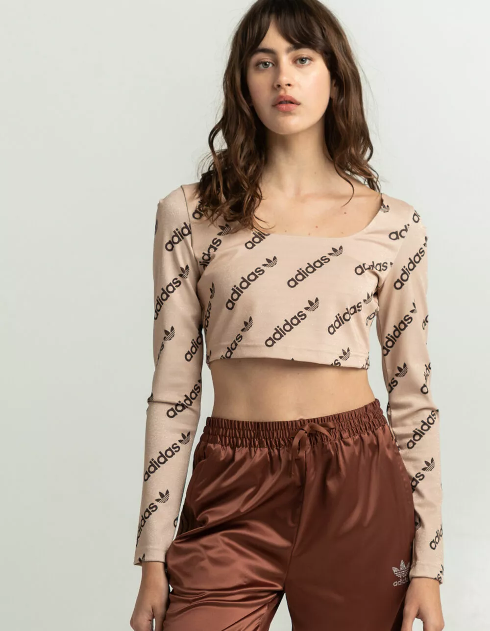 Adidas Logomania Crop Top. All over logo print. Wide square neck. Long sleeves. Crop top. 60%Recycled Polyester 14% Polyester 12% Rayon 9% Metalized Fiber 5% Spandex. Machine wash. Imported.