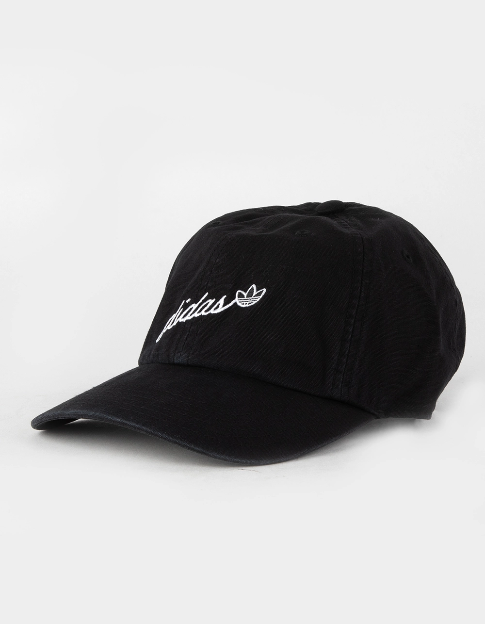 Adidas Original Script Strapback Hat. Adidas script embroidery on front. Logo embroidery on back. Curved visor. Adjustable strapback. 100% Cotton. Hand wash. Imported.