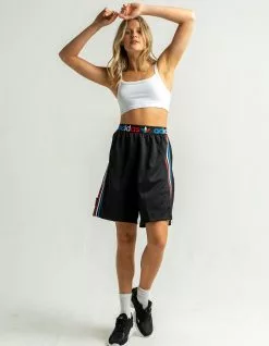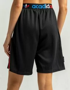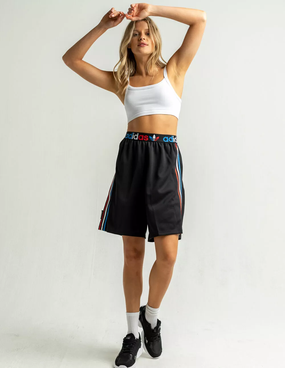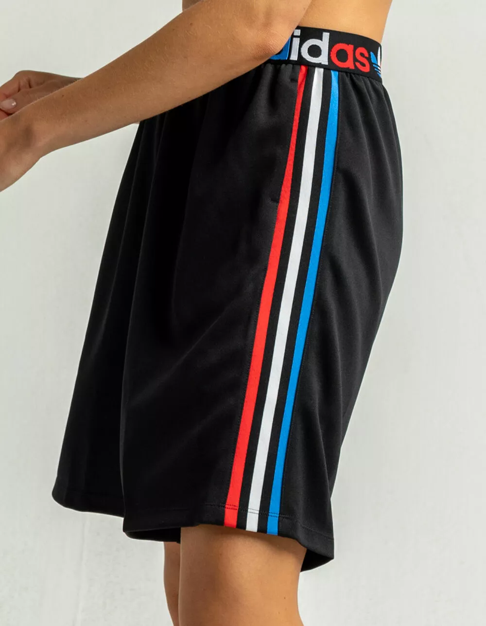 Adidas Primeblue Shorts. Solid longline shorts. 3-stripe detail at sides. High rise waist. Elastic waistband with bold adidas logo tape. Welt hand pockets. Relaxed fit. Made with Parley Ocean Plastic. Approx. inseam: 9.5″. 100% recycled polyester. Machine wash. Imported.