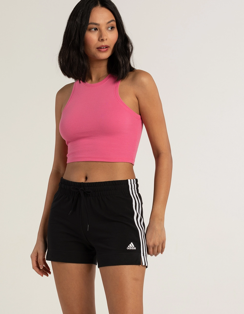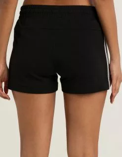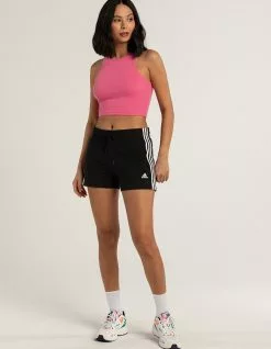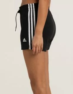 Adidas Essential Slim Shorts. Elastic waistband with drawstrings. Adidas logo embroidered on left leg. Classic 3-stripes down pantlegs. Approx. inseam: 3.75”. 93% Cotton. 75 Spandex. Machine wash. Imported.
