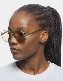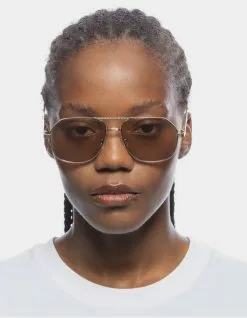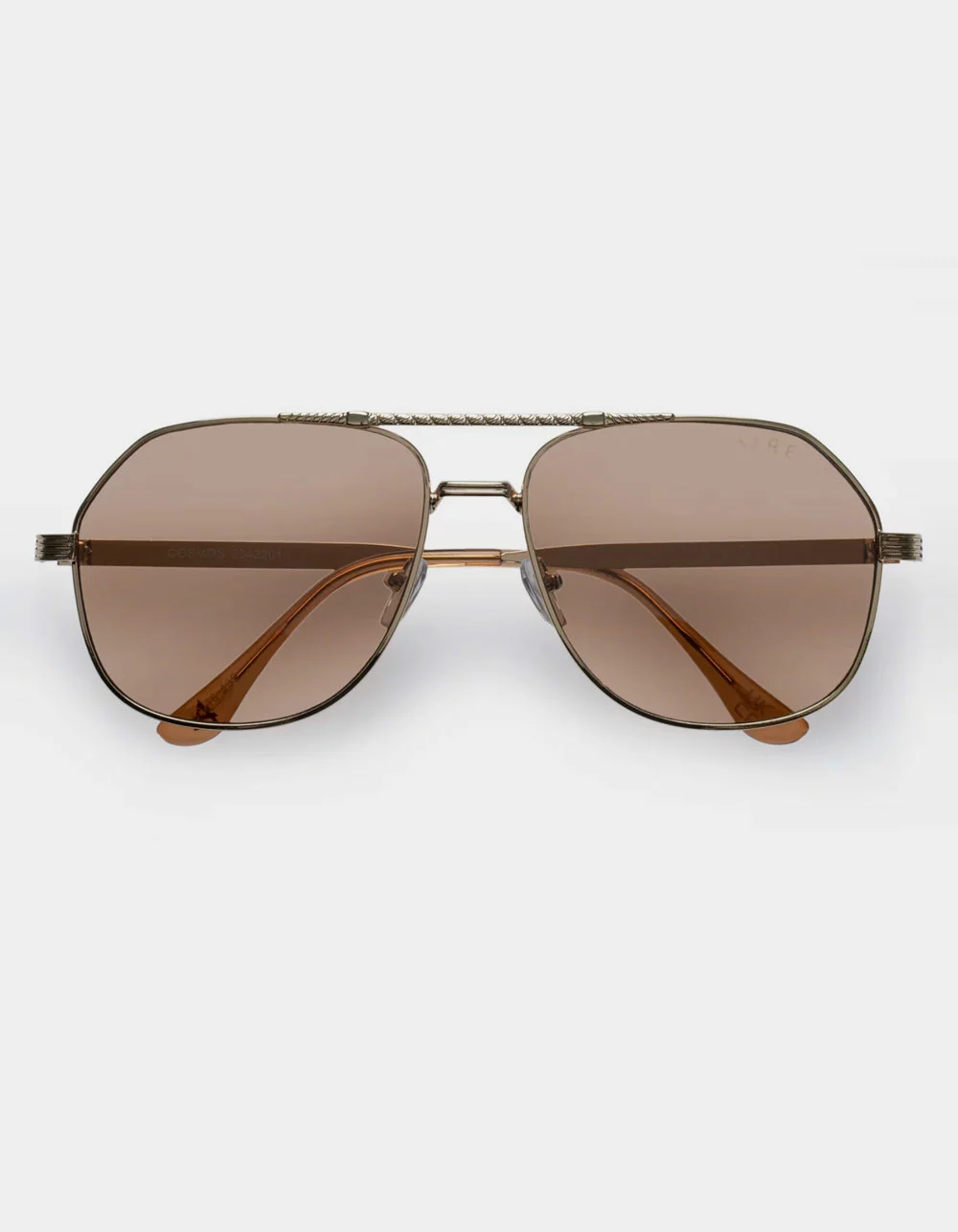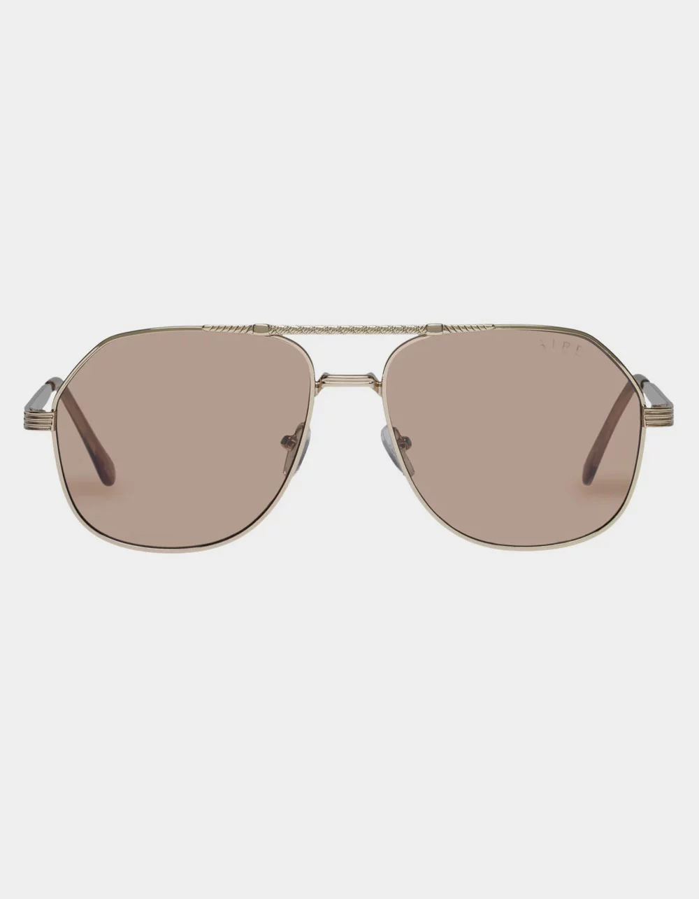 AIRE Cosmos Sunglasses. 70s inspired aviator sunglasses. Full rim metal featuring a textured metal top bar. Bright gold frame featuring on trend tan tint lenses. AIRE logo lens etch and gold foil tip. Made from metal using GRS certified recycled polycarbonate materials components. Packaged with AIRE khaki sunglass pouch made from GRS certified recycled materials. Imported.