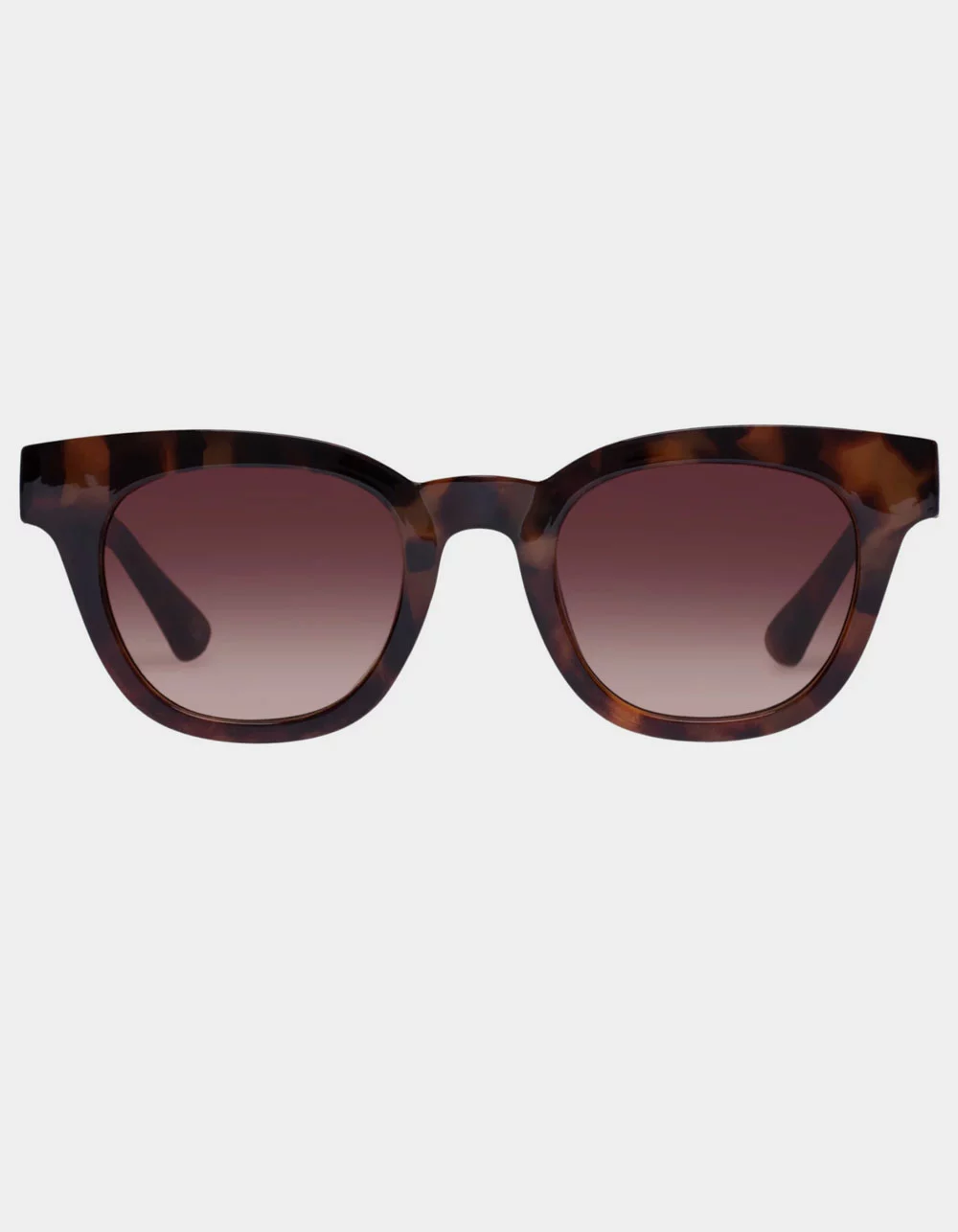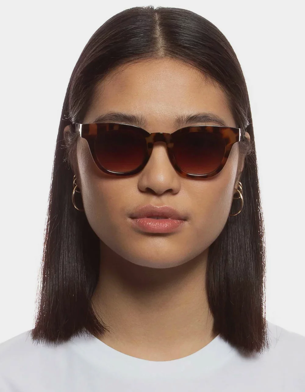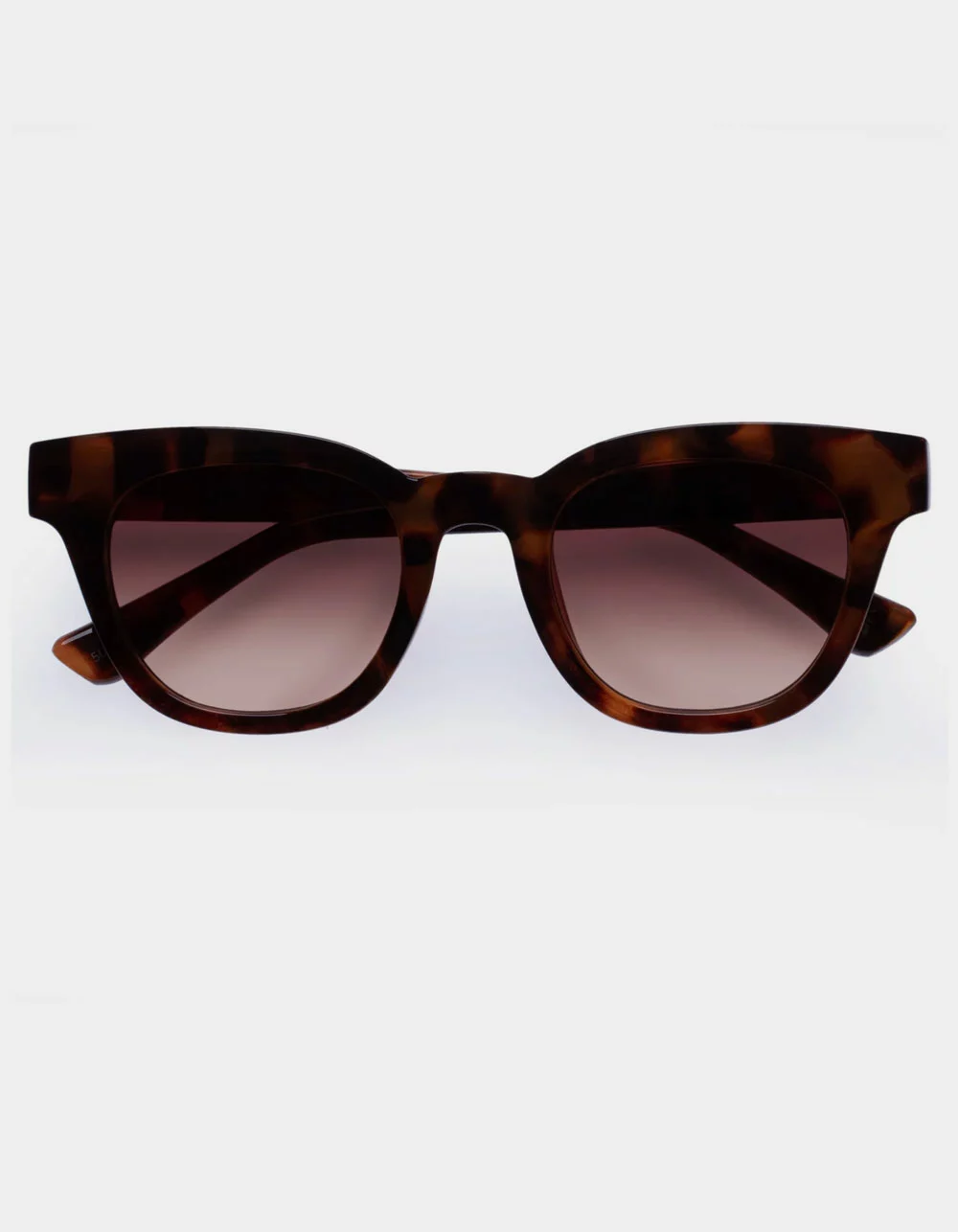 AIRE Dorado Sunglasses. Signature, everyday sunglasses. Bold angles. Dark tort frame featuring classic brown grad lenses. AIRE gold foil logo detailing on both temples. Made from GRS certified recycled polycarbonate frame material. Packaged with AIRE khaki sunglass pouch made from GRS certified recycled materials. Imported.