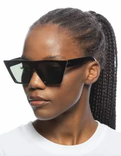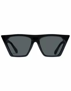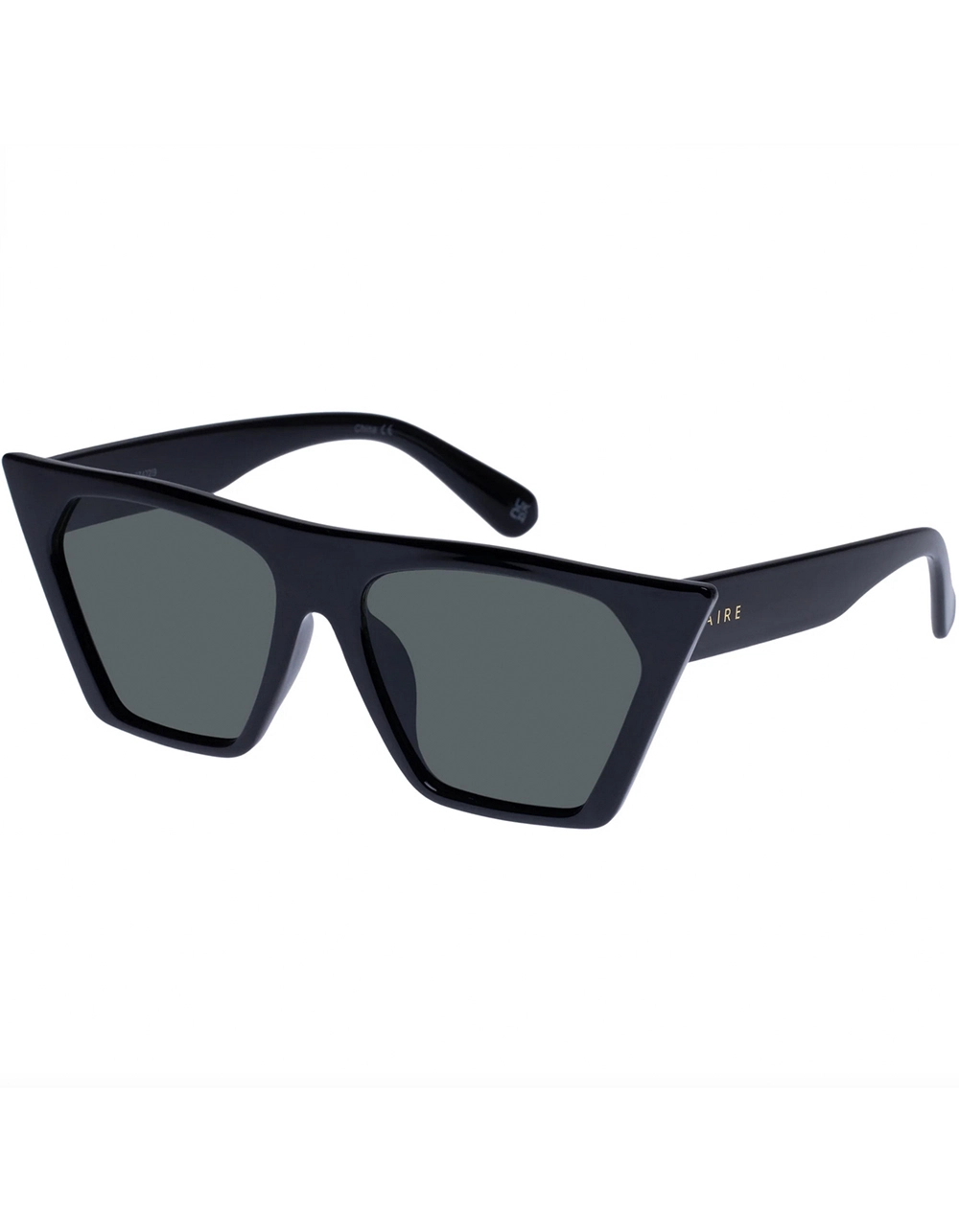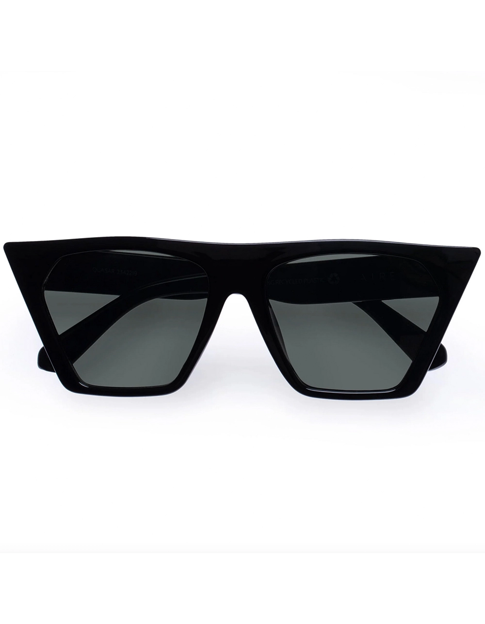 AIRE Quasar Sunglasses. Modern take on the cat eye shape, featuring oversized proportions. Large size fit. Flat top design with sharp, modern angles. AIRE gold foil logo detailing on both temples. Made from GRS certified recycled polycarbonate frame material. Packaged with AIRE khaki sunglass pouch made from recycled materials. Imported.