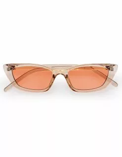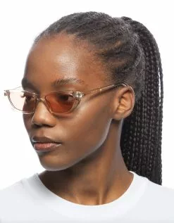 AIRE Titania Sunglasses. Angular, round silhouette with metal rivet detailing. Small fit. Classic silhouette with a modern twist. AIRE gold foil logo detailing on both temples. Made from GRS certified recycled polycarbonate frame material. Packaged with AIRE khaki sunglass pouch made from from recycled materials. Imported.
