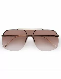 AIRE Venatici Sunglasses. Rimless aviator featuring oversized proportions. Large size fit. Perfect for poolside or festival. AIRE logo lens etch and gold foil tip. Made from metal using GRS certified recycled polycarbonate materials components. Packaged with AIRE khaki sunglass pouch made from recycled materials. Imported.