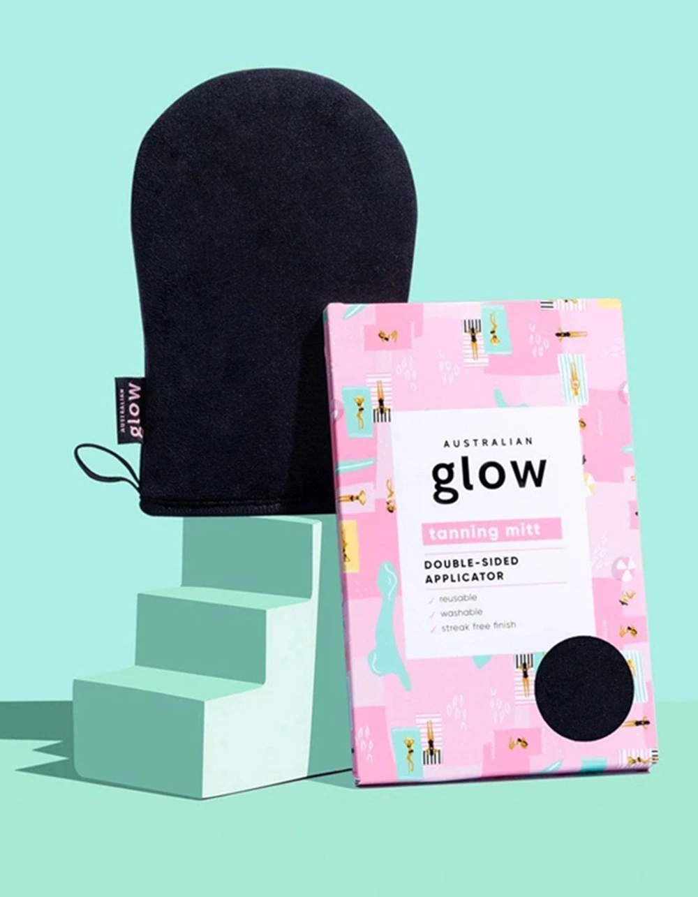 Australian Glow Reusable Tanning Application Mitt. Introducing the Australian Glow’s self tanning application mitt. Our reusable tanning mitt is machine washable, and made to suit all of Australian Glow’s Mousses, Lotions and Mists. Our tanning mitt enables you to apply an even streak free, glowing tan every time – And best of all you will never have stained hands again. Imported.