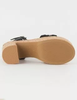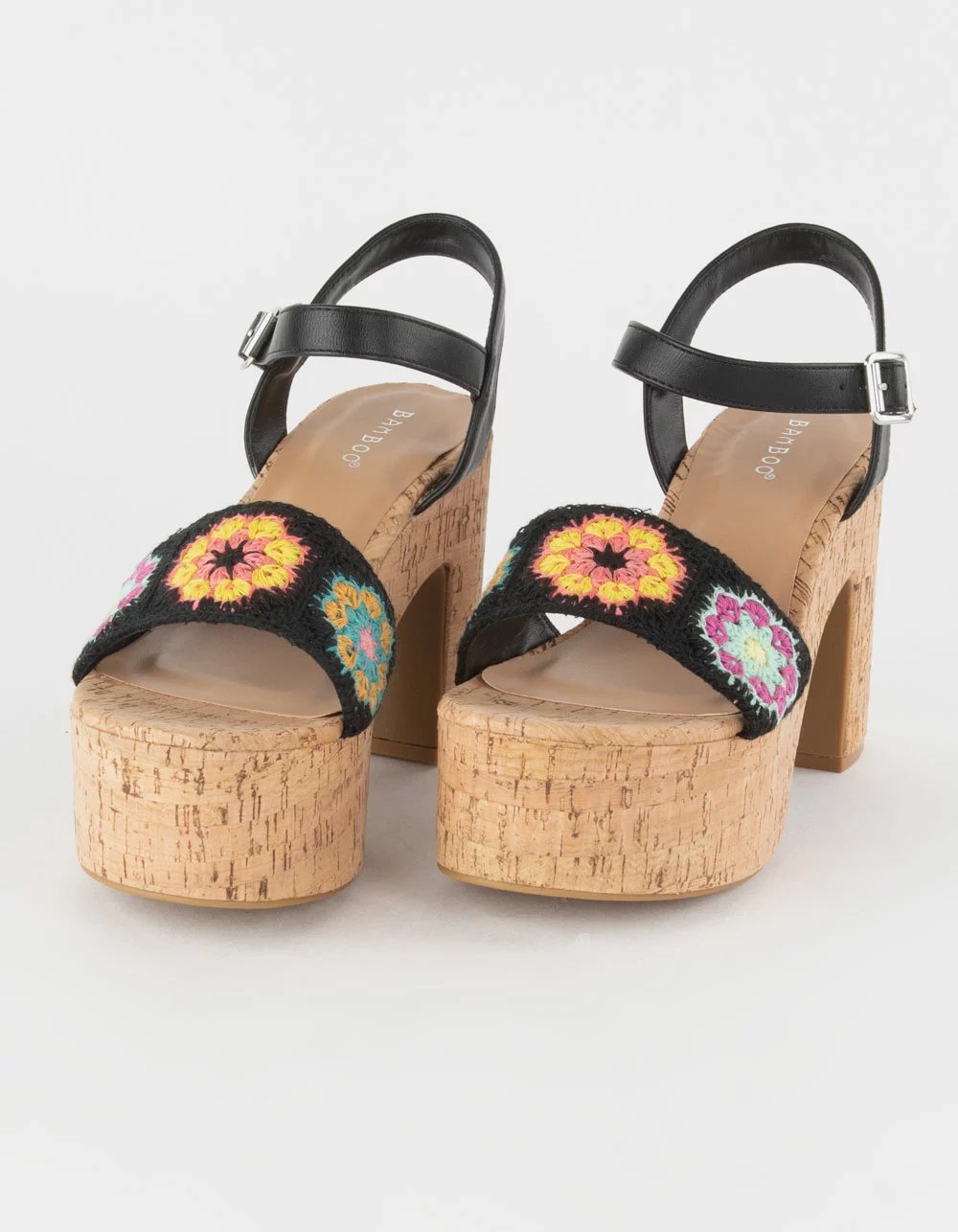 Bamboo Crochet Platform Sandals. Crochet detail on front strap. Ankle strap with buckle. Approximate heel height: 4″. Approximate platform height: 2″. Imported.