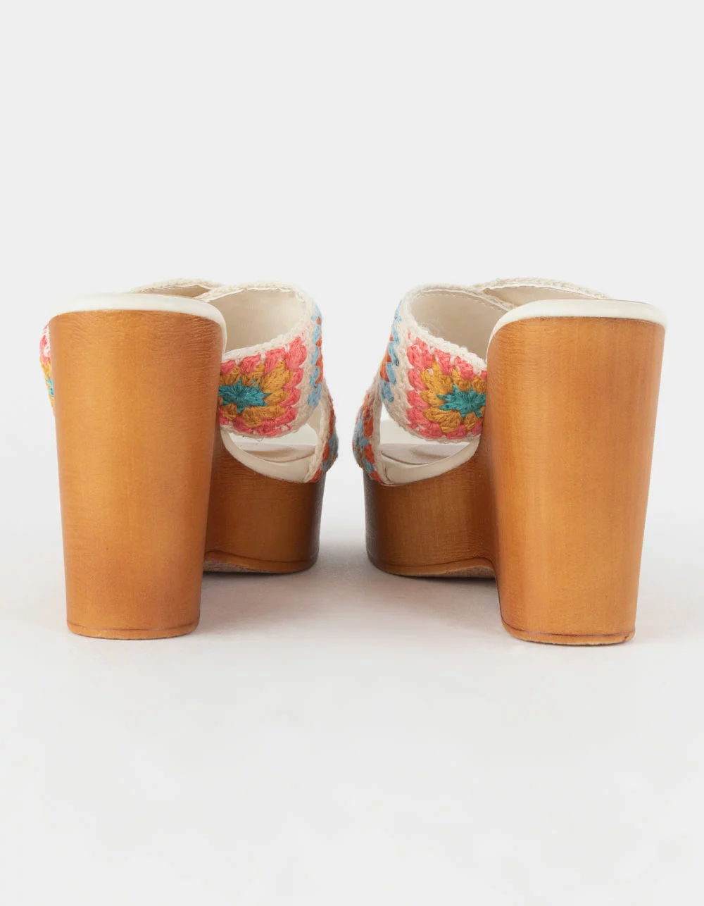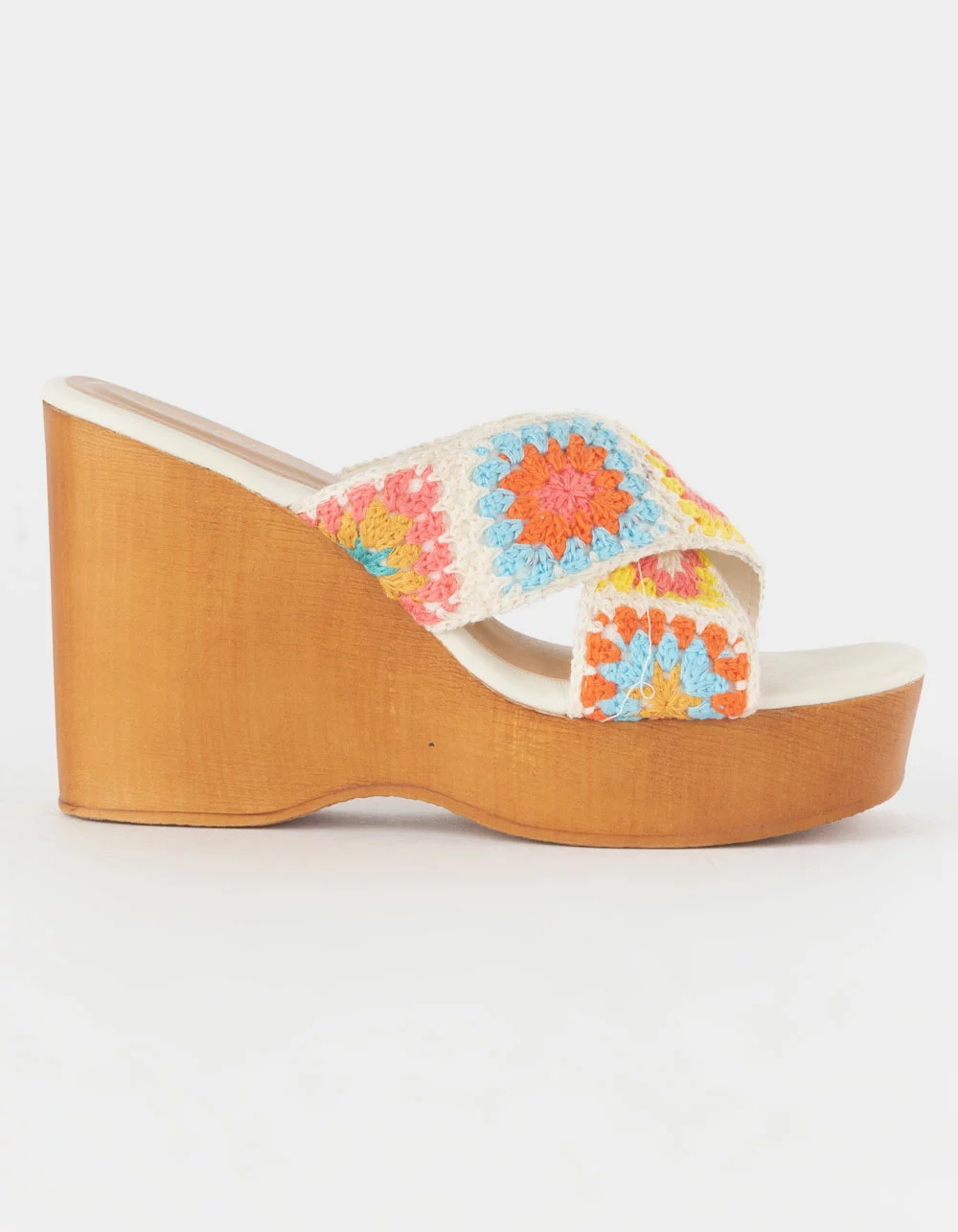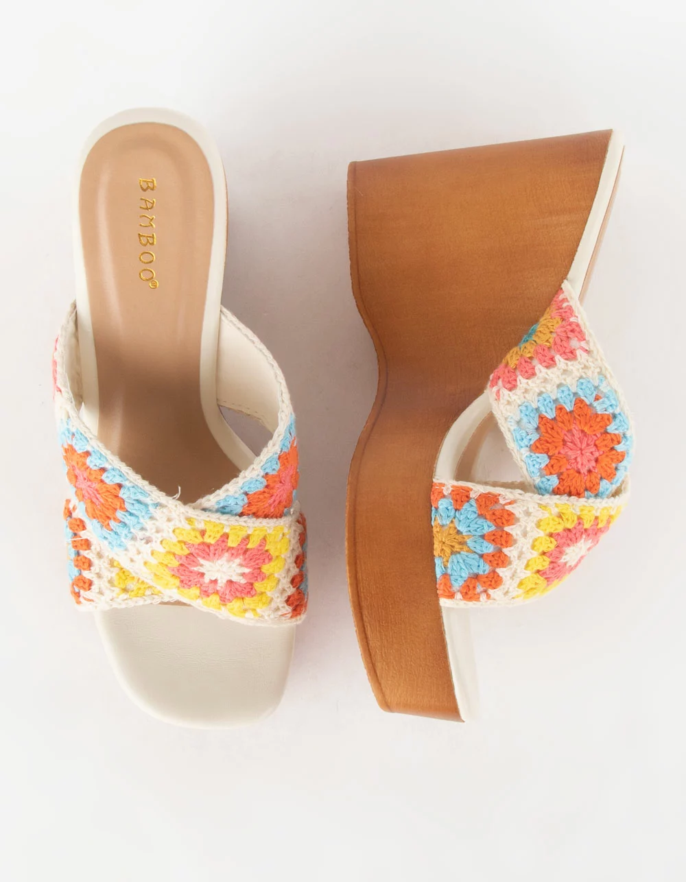 Bamboo Crochet Wedge Sandals. Slip-on style. Two straps with crochet detail. Approximate heel height: 4.5″. Approximate platform height: 1″. Imported.