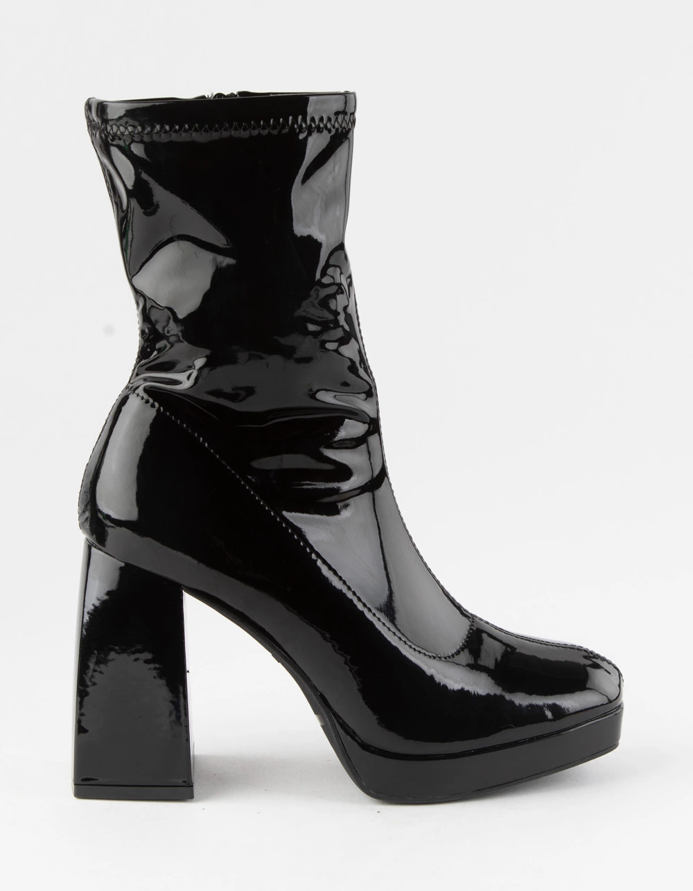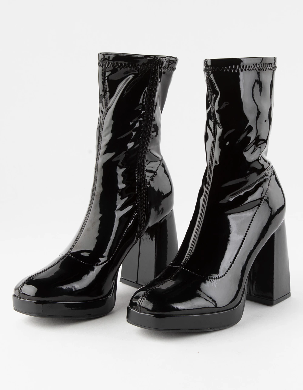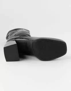 Bamboo Gradient Platform Stretch Boots. PU Leather. Stretch shaft. Side zip closure. Texture outsole. Block heel. 4″ Heel height. Imported.