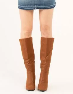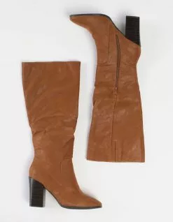 Bamboo Soundscape Knee High Boots. Side zip. square toe. Stacked heel. Knee high length. Approx. Heel height: 3.75″. Imported.