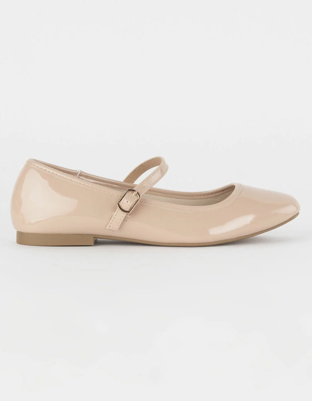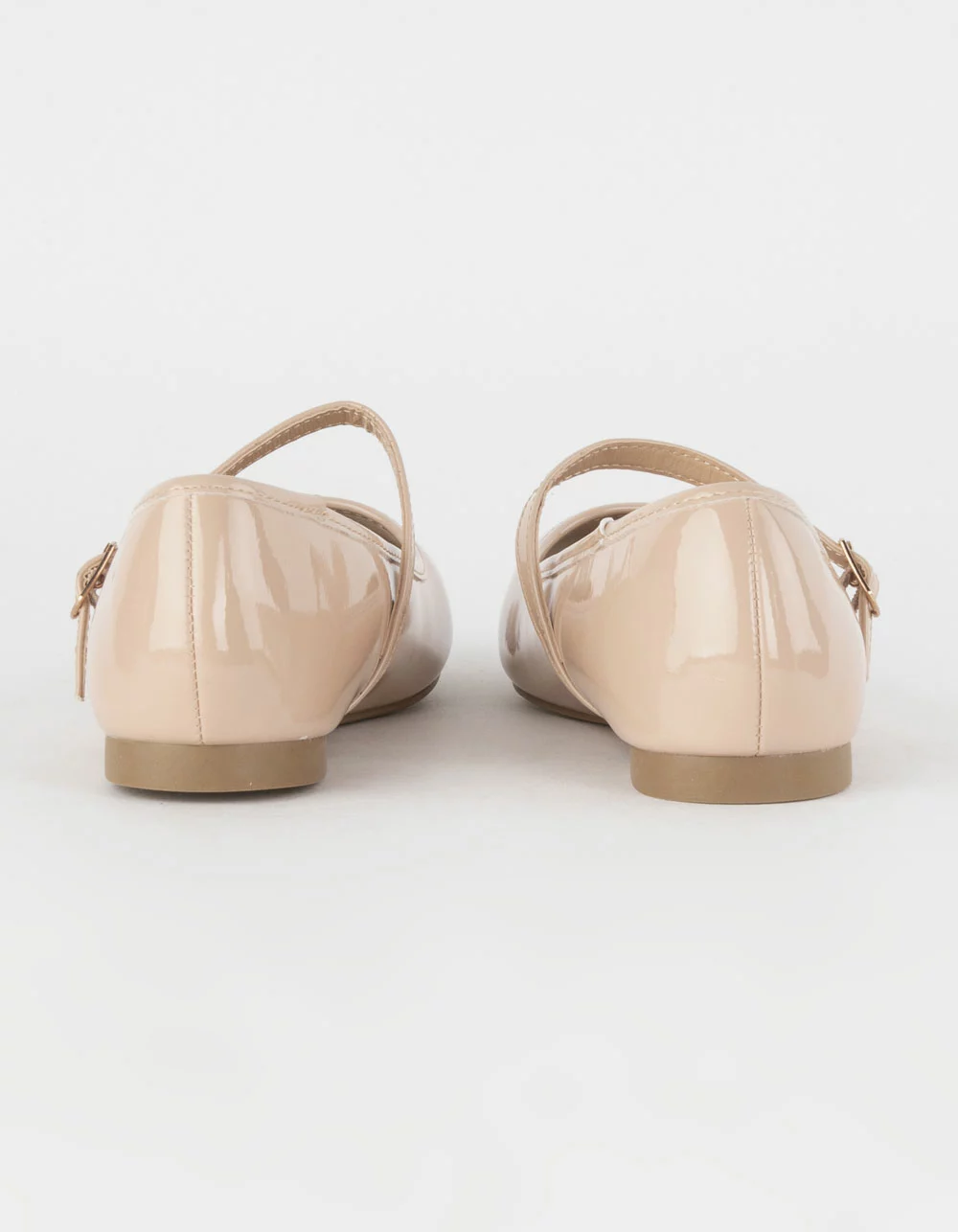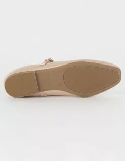Bamboo Sweep Ballet Flats. Faux leather upper. Pin buckle strap across top of foot. Square toe. Cushioned footbed. Rubber outsole. All manmade material. Imported.