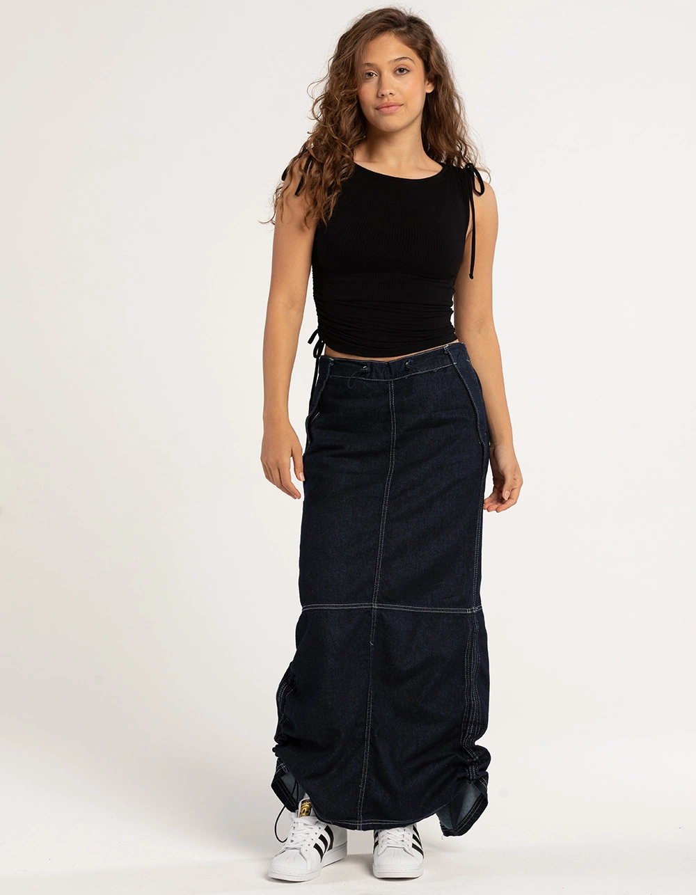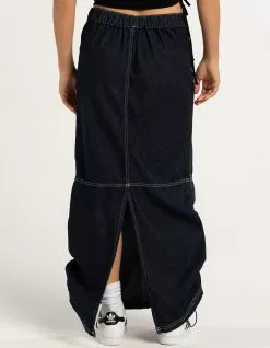 BDG Urban Outfitters Baggy Maxi Skirt. Demin skirt with elastic waistband and adjustable toggles for a custom fit. Zipper pockets. Adjustable toggles at hem. Back vent. Approx. length: 39.5”. 80% Cotton, 20% Recycled Cotton. Machine wash. Imported.