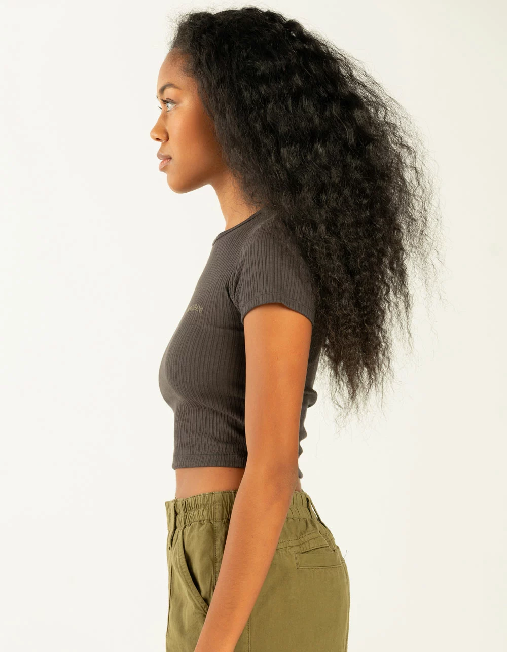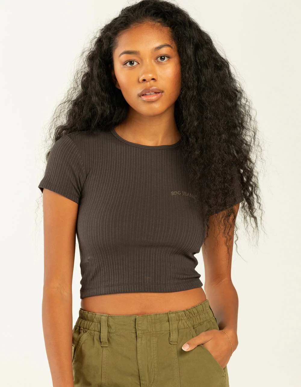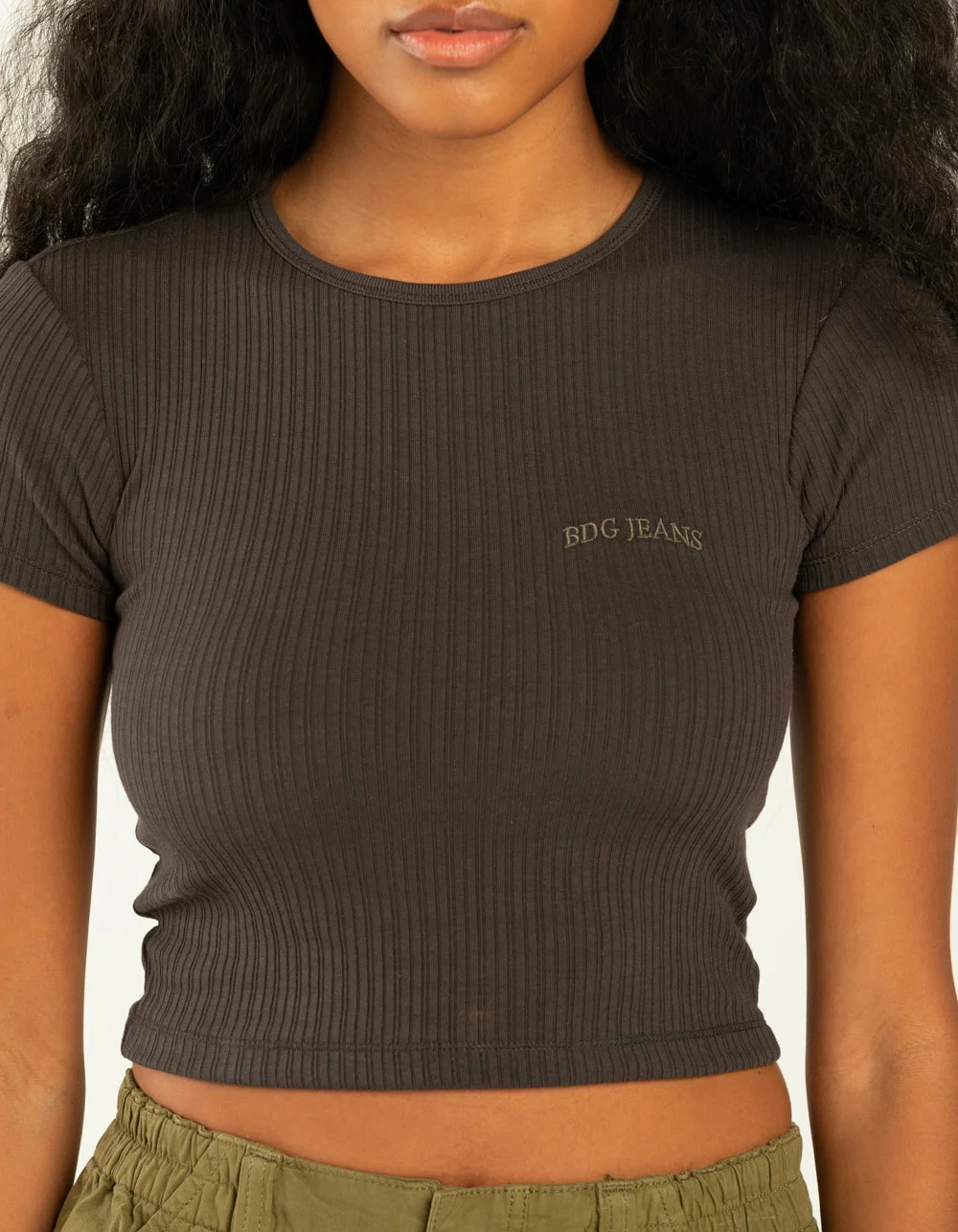 BDG Urban Outfitters BDG Jeans Rib Baby Tee. Round neckline. Short cap sleeves. BDG Jeans embroidered at left chest. Fitted all over ribbed fabric. 50% cotton/50% polyester. Machine wash. Imported.