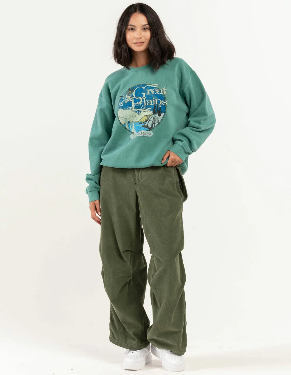 BDG Urban Outfitters Great Plains Crew Neck Sweatshirt. Graphic on front. Cuffed long sleeves and hem. Ribbed crew neckline. Long sleeves. 50% Cotton 50% Polyester. Machine wash. Imported.