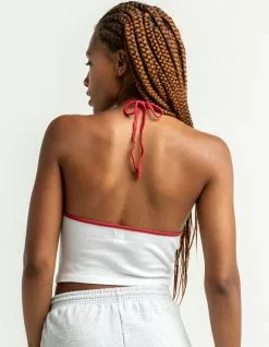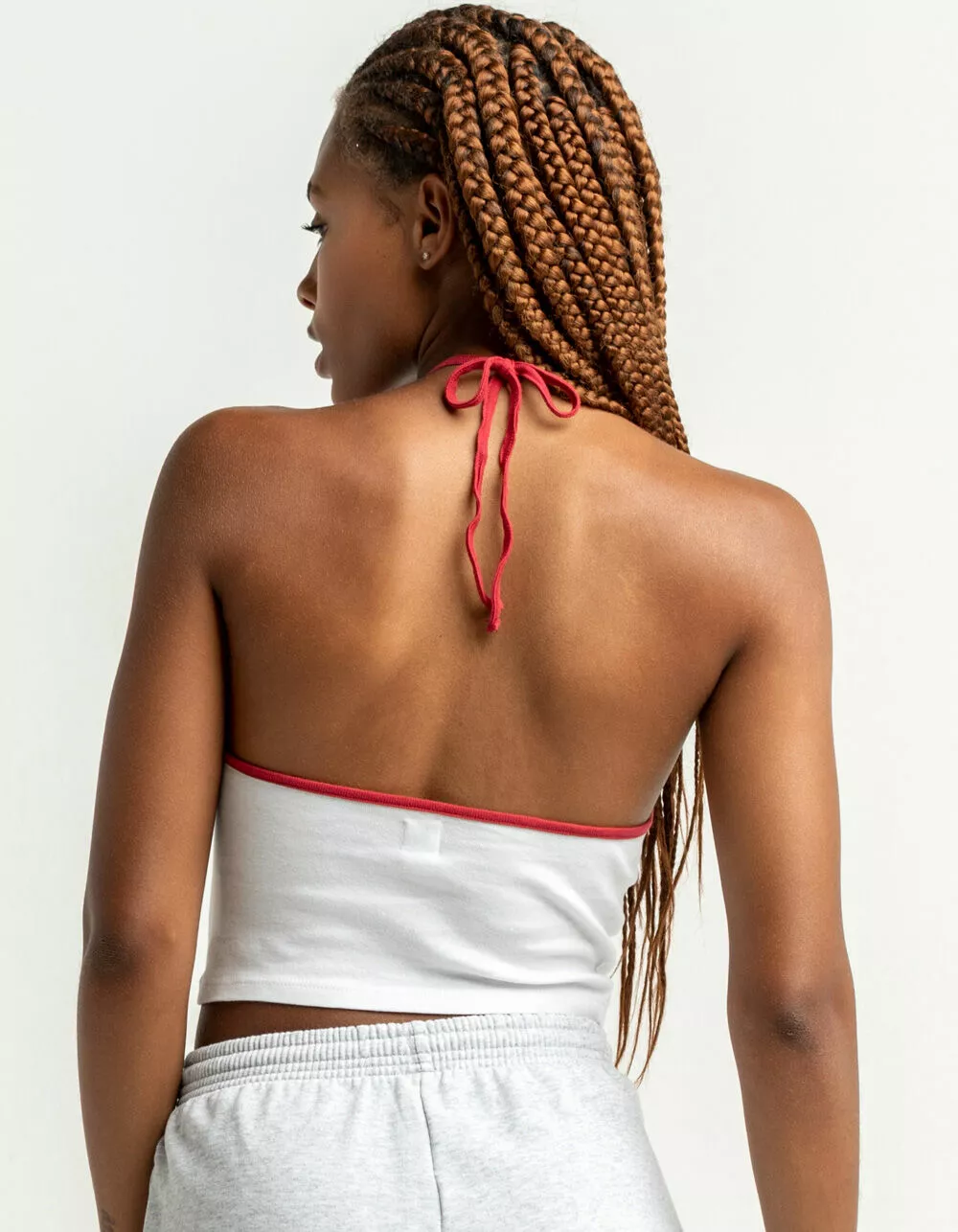 BDG Urban Outfitters Halter Top. Tie closure at neck. Low backline. BDG design embroidered at left chest. Crop hem. Contrast binding. 100% organic cotton. Machine wash. Imported.
