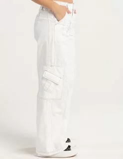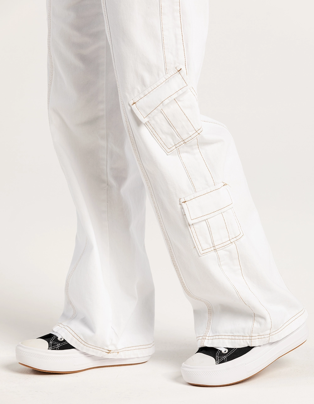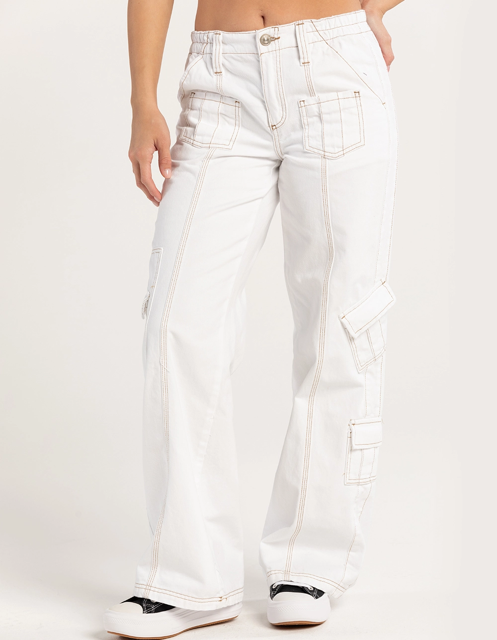 BDG Urban Outfitters Y2K Denim Cargo Pants. Zipper fly with button closure. Belt loop waist. Elastic waist. Slant hand pockets, welt pockets and cargo pockets. Contrast stitching. Straight leg. High rise. Approx. inseam: 31”. 80% Cotton, 20% Recycled Cotton. Machine wash. Imported.