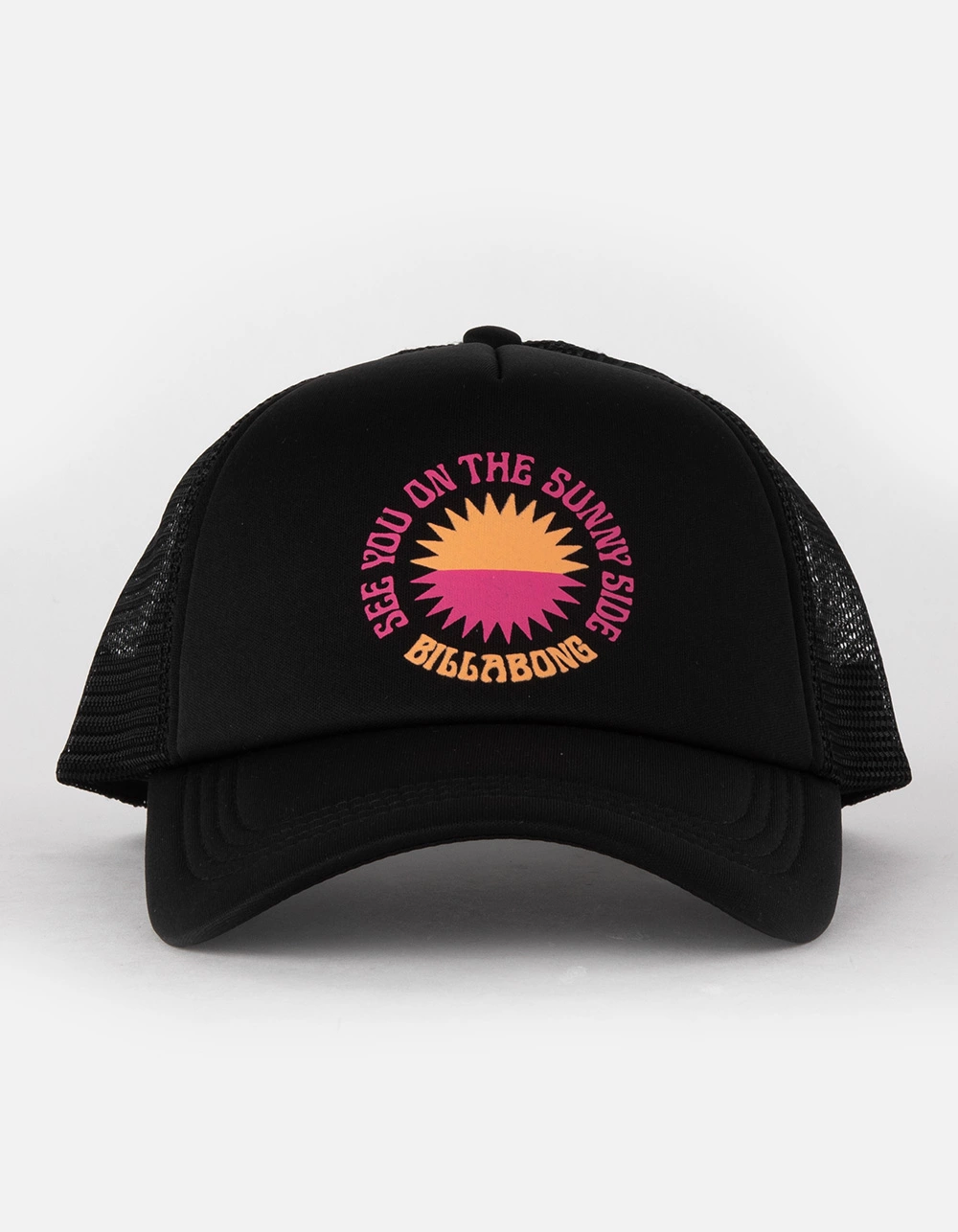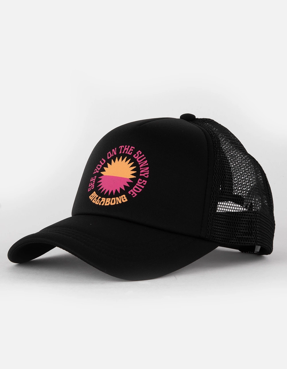Billabong Across Waves Trucker Hat. Graphic at front. Cushioned front panel. Mesh back. Adjustable snapback. Woven Label on closure. 100% Polyester. Imported.