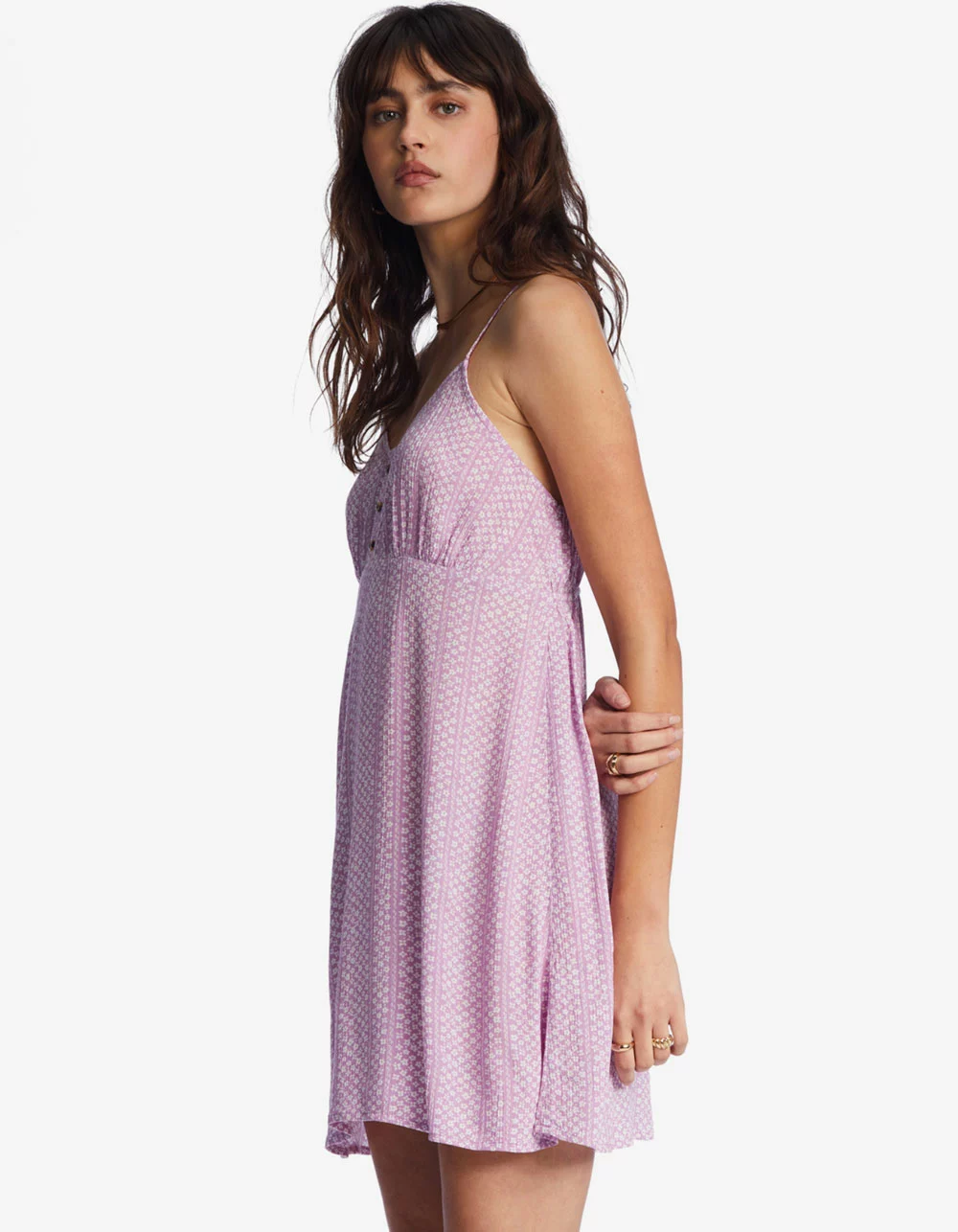 Billabong As If Mini Dress. Made of airy crinkle fabric, this printed baby doll mini dress has a V-neck design that’s fitted at the chest and easy through the skirt. Fitted bodice, easy skirt fit. Metal plate branding. Faux buttons on front bust. 100% Viscose. Imported.