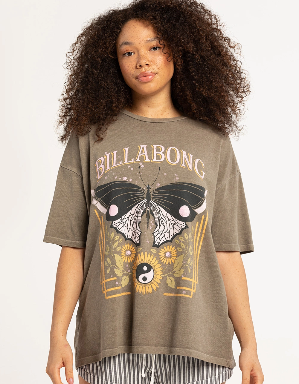 Billabong Balance Butterfly Boyfriend Tee. Large butterfly graphic screened on front. Ribbed crew neckline. Short sleeve. Oversized fit. 100% Cotton. Machine wash. Imported.