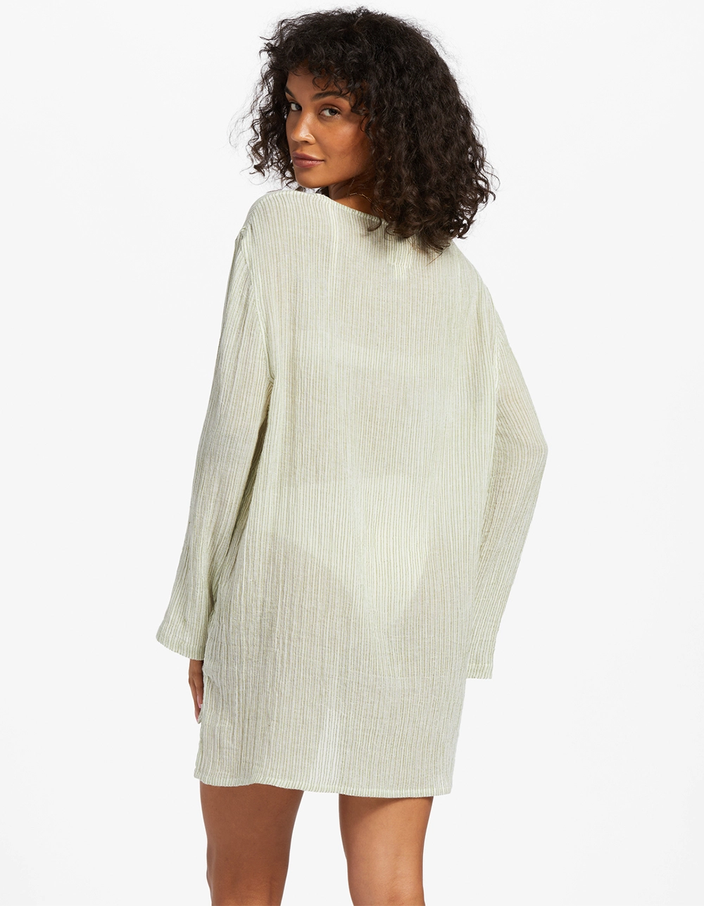 Billabong Blue Skies Swim Cover-Up. Made of tidal cotton with a textured stripe, the Blue Skies beach cover-up is the perfect breezy layer for the beach, the pool, and your impromptu holidays abroad. It has a relaxed fit with a deep, lace-up V-neck and long sleeves. Instant vacay mode. Metal plate branding. 100% Cotton. Machine wash. Imported.