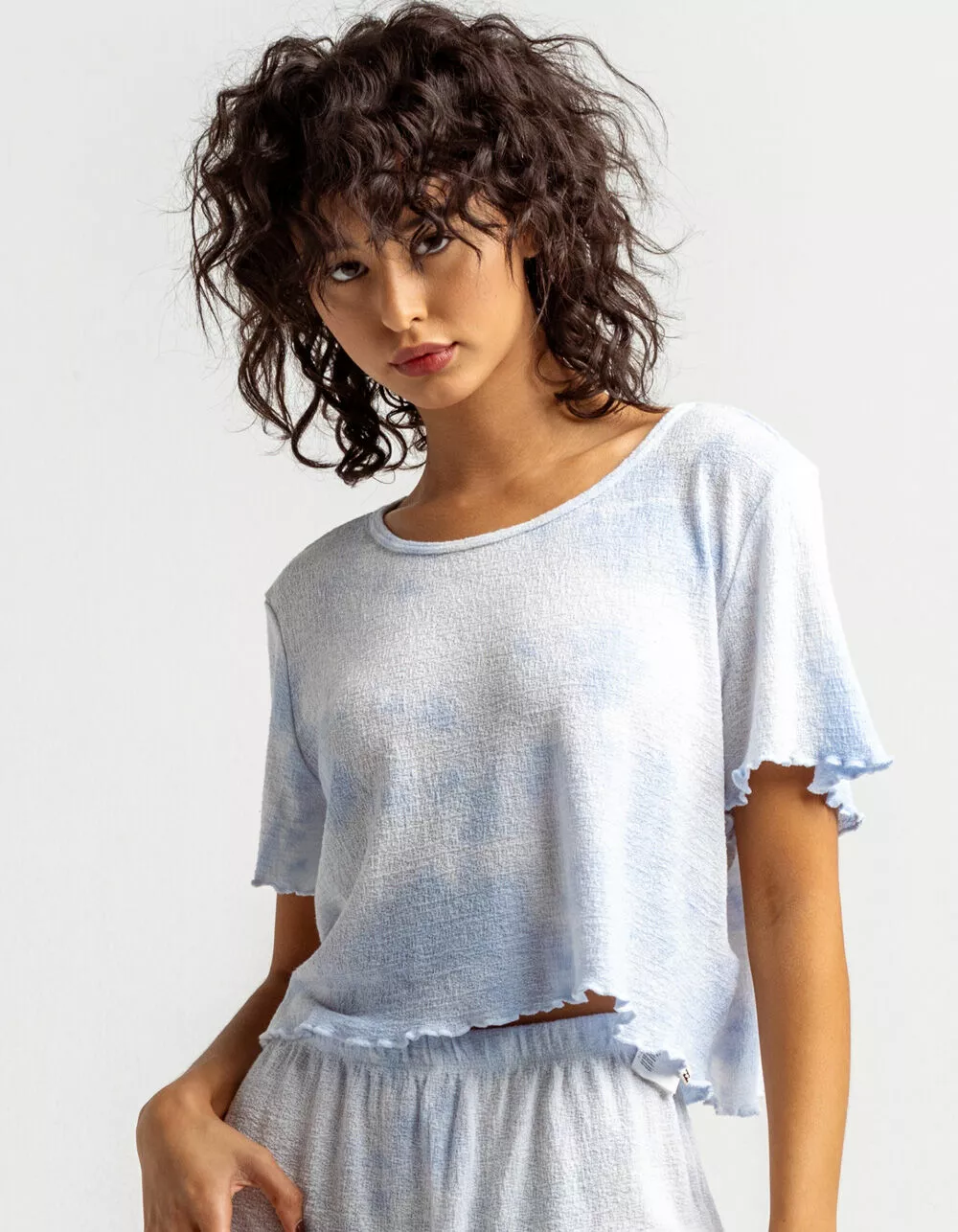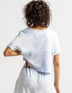 Billabong Breeze By Top. Lightweight knit design. Allover tie dye wash. Round neckline. Short sleeves. Relaxed fit. Lettuce edges. Woven Billabong label at front left hem. 60% cotton/40% polyester. Machine wash. Imported.