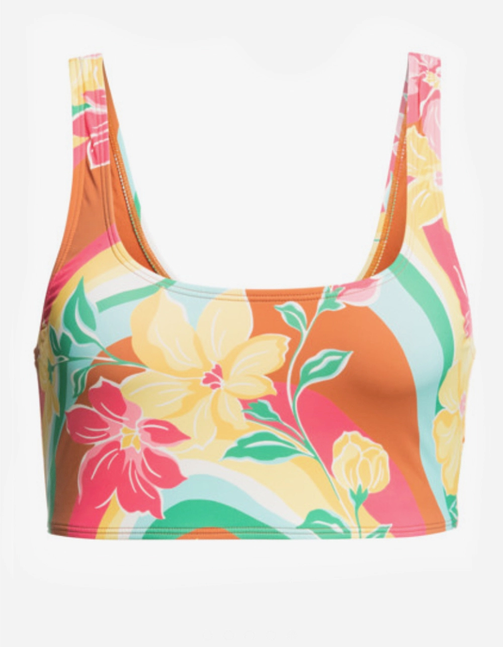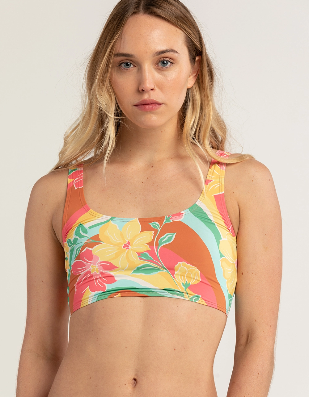 Billabong Chasin Sunbeams Tank Bikini Top. Chase the sun, hunt for swell. Made of recycled Peach Stretch nylon, this full-coverage printed bikini top has a sleek pullover design. Bonus? She doubles as a tank top. Scoop front neckline. Fixed straps. Fixed closure. Logo embroidery. 78% Recycled Nylon, 22% Elastane. Hand wash. Imported.