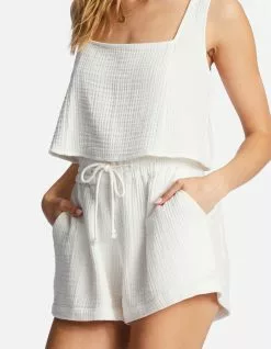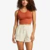 Billabong Day Tripper Elastic Shorts. Made of cotton double gauze, these high-waisted beach shorts have an elasticated waistband with side pockets and a rope drawcord for a perfect warm-weather look. Fixed closure. Regular fit. Slash pockets on front. Patch pockets on back. Woven sew down label. Approximate inseam: 2 1/4″. 100% Cotton. Machine wash. Imported.