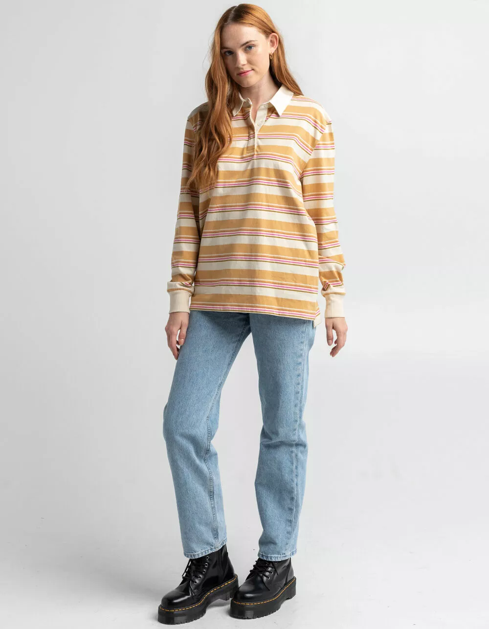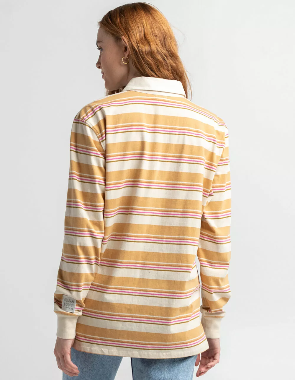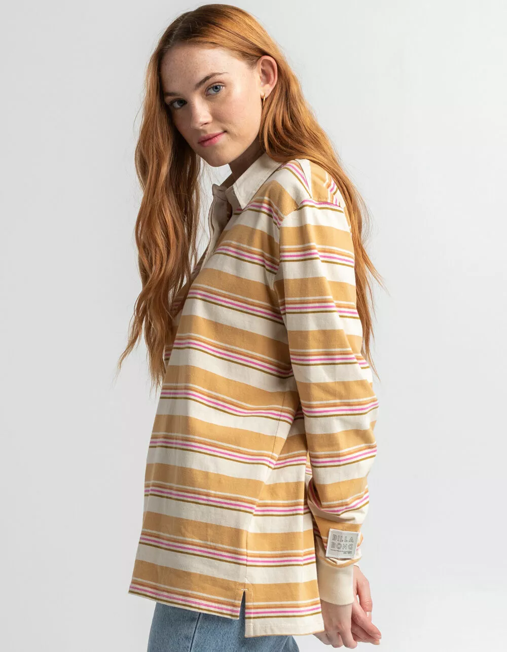 Billabong Polo Double Up Rugby Polo Shirt. Striped polo shirt. Flat collar. Hidden three button placket.Long Sleeves,. Ribbed cuffs and hem. Embroidery at left chest. 100% cotton. Machine wash. Imported.