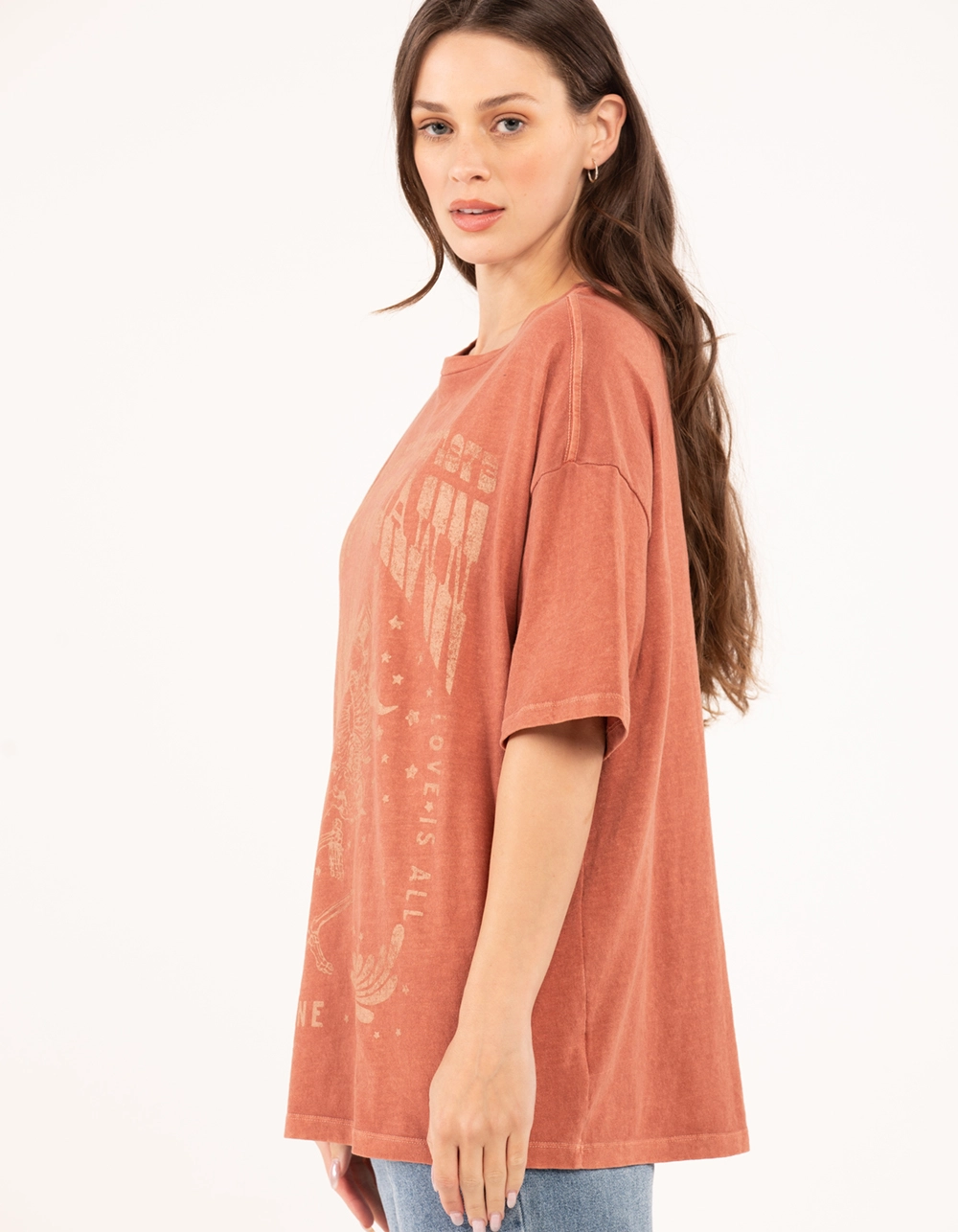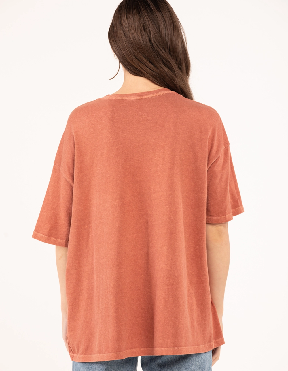 Billabong Dusk Oversized Tee. Graphic on front. Ribbed crew neckline. Short sleeves. Oversized fit. 100% Cotton. Machine wash. Imported.