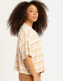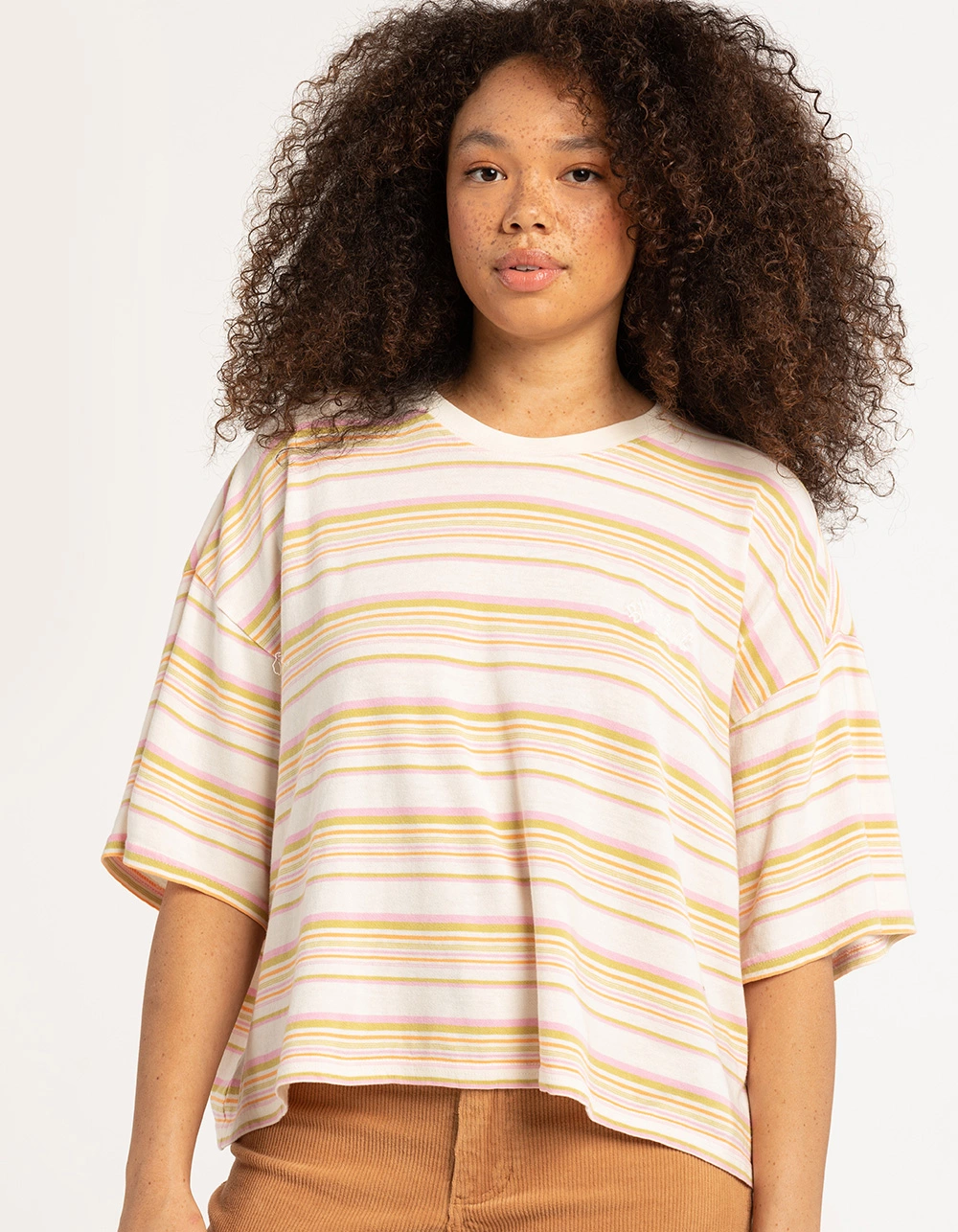 Billabong Feeling Free Knit Tee. Sun on your face, wind in your hair— carefree days are best spent in the Essentials collection Feeling Free boxy t-shirt. Lightweight and comfortable, it features sunset-inspired stripes on premium cotton jersey, plus a ribbed neckband and embroidered logo art at the left chest. 100% Cotton. Machine wash. Imported.
