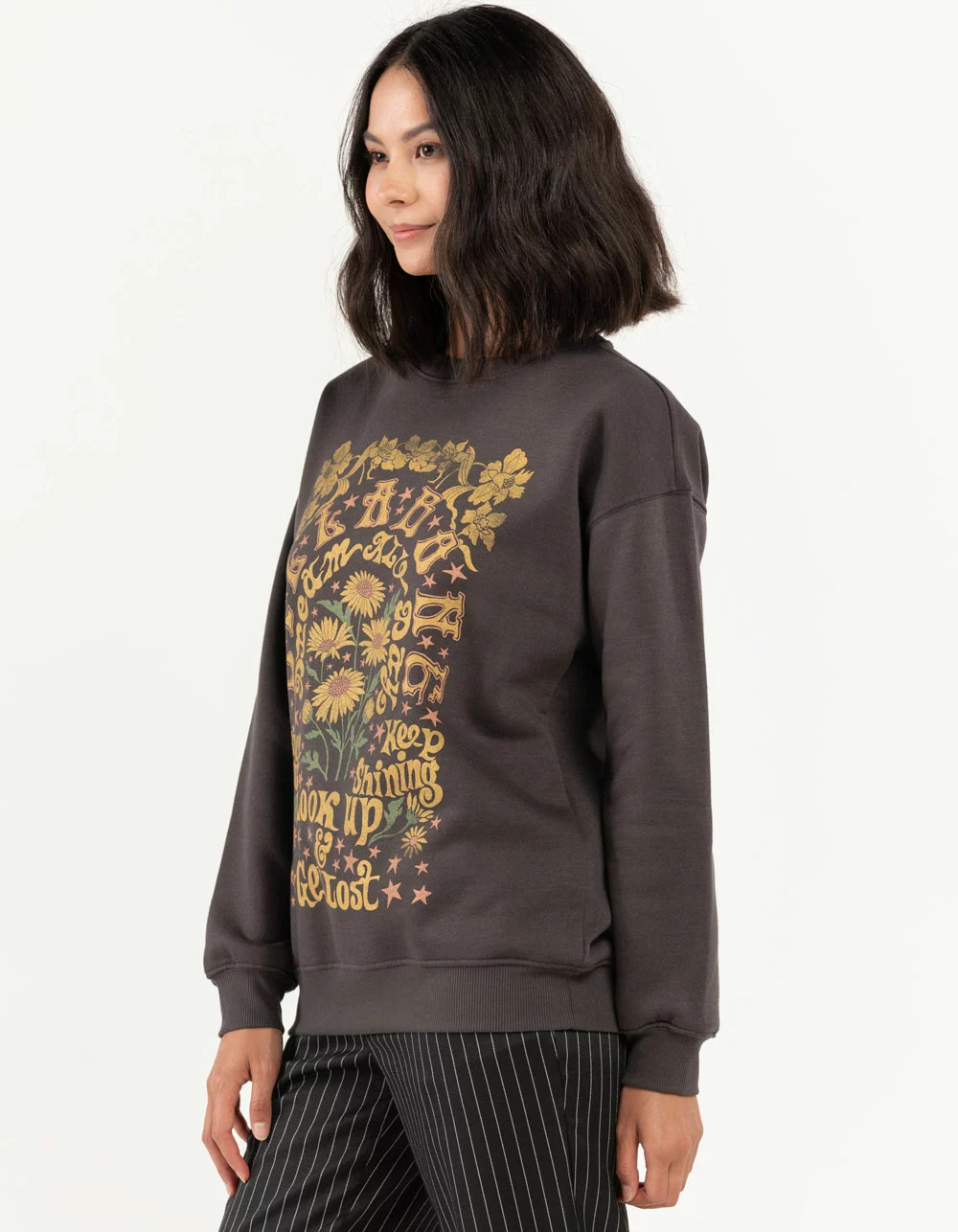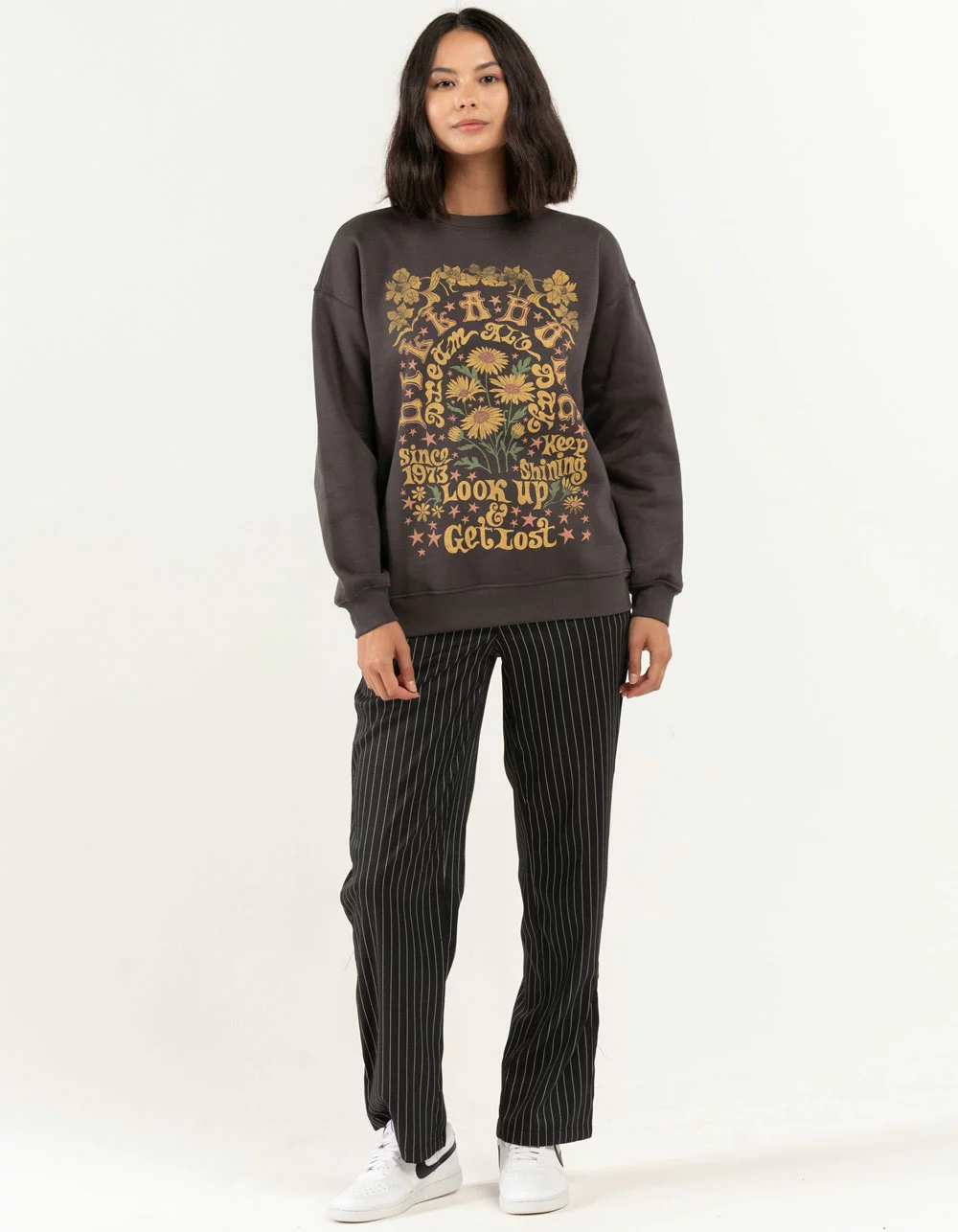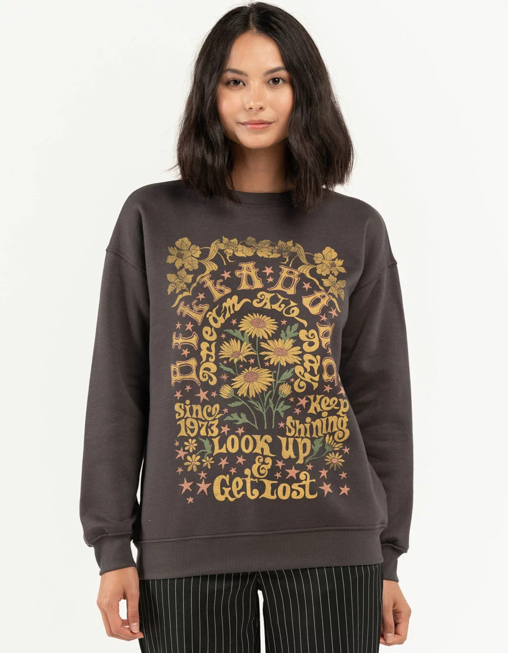 Billabong Golden Wonder Oversized Crew Neck Sweatshirt. Graphic on front. Cuffed long sleeves and hem. Ribbed crew neckline. Long sleeves. 55% Cotton 45% Polyester. Machine wash. Imported.