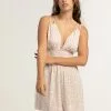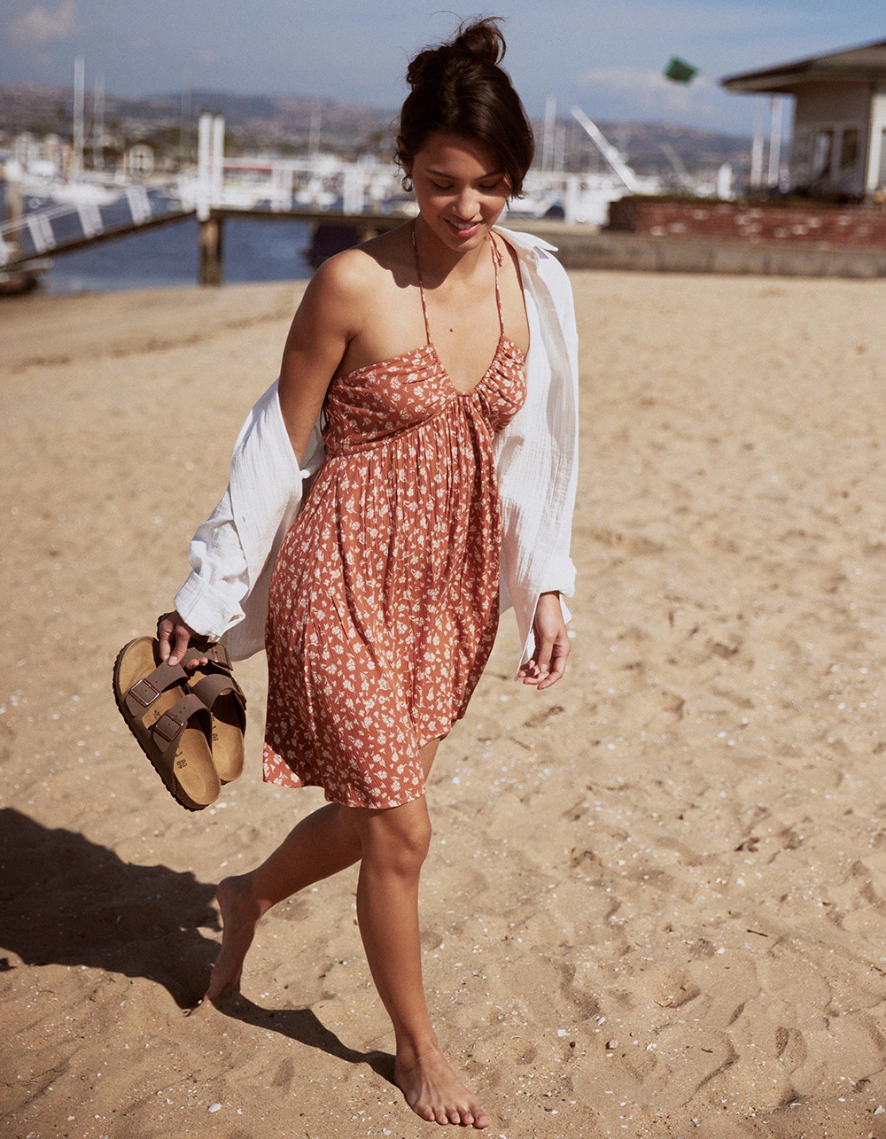 Billabong Happy Hour Halter Dress. Allover floral print. Keyhole neckline and halter tie neck straps. Elastic waist. Approx. length: 26”. 100% Viscose. Hand wash. Imported.