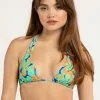 Billabong Islands Away Fiji Plunge Triangle Bikini Top. Two floral prints. Padded Cups. Pullover bralette. Triangle cup. Banded Hem. Full coverage. Wide shoulder straps. Embroidered Billabong logo. 78% Recycled Nylon, 22% Elastane. Hand wash. Imported.