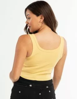 Billabong Parade Crop Tank Top . Graphic on front. Scoop neckline. Sleeveless. Crop raw hem. 100% Cotton. Machine wash. Imported.