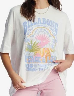 Billabong Peace And Love Oversized Tee. Large graphic on front. Durable Water Repellent (DWR) fabric treatment to keep you dry and protected from the elements. Oversized fit. Crew neck. Short sleeve. 100% Cotton. Machine wash. Imported.