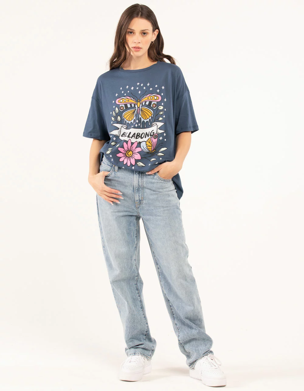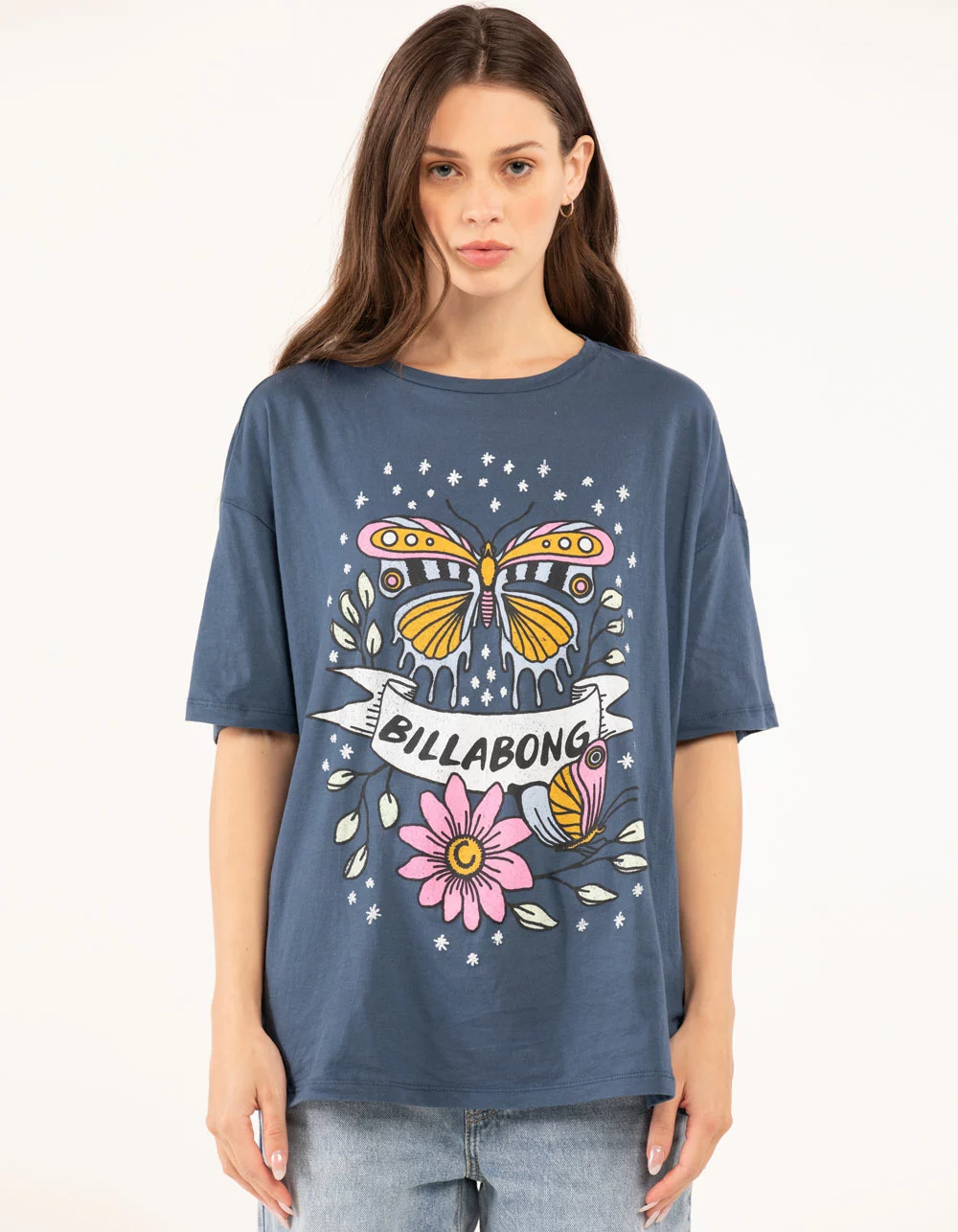 Billabong Pop Oversized Tee. Graphic on front. Ribbed crew neckline. Short sleeves. 100% Cotton. Machine wash. Imported.