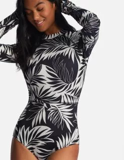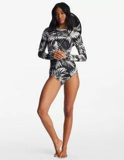 Billabong Spotted In Paradise One-Piece Swimsuit. Made of recycled stretch fabric with a mock neck and an open back, this printed long-sleeve swimsuit offers enhanced sun protection for longer sessions and premium performance. UPF 50+ sun protection. Performance fit. Mock neck. Medium bum coverage. Open back. 85% Recycled Polyester, 15% Elastane. Hand wash. Imported.