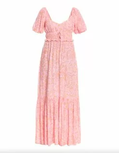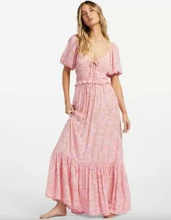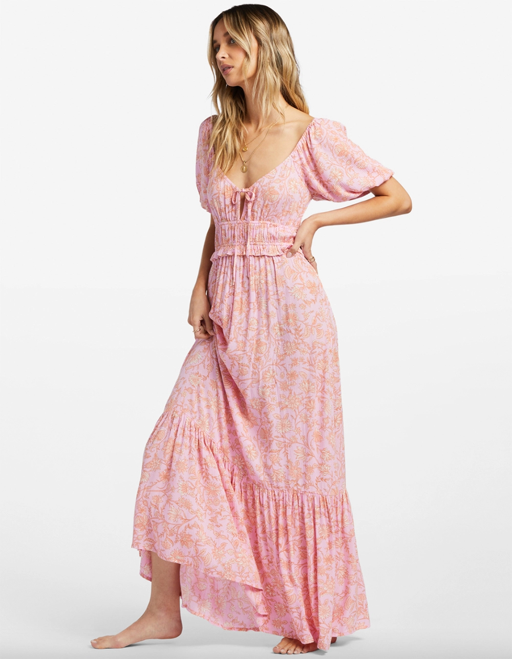 Billabong Sweet On You Maxi Dress. Made of airy crinkle fabric, this printed maxi dress brings the romance with puff sleeves, a fitted bodice with a keyhole and front ties, and playful ruffles at the waistline and bottom hem. Encased elastic at waistline with baby ruffle at waist. Keyhole detail at front bust with matching fabric ties. Metal plate branding. 100% Viscose. Imported.
