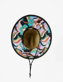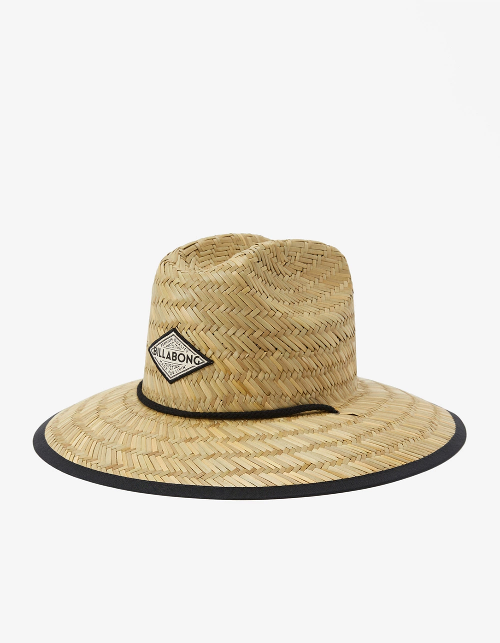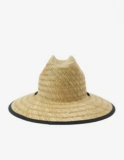 Billabong Tipton Straw Lifeguard Hat. Drawcord binding and contrast brim. Billabong logo patch branding. Adjustable drawcord. Wide brim with printed fabric underneath brim. 100% Straw. Imported.