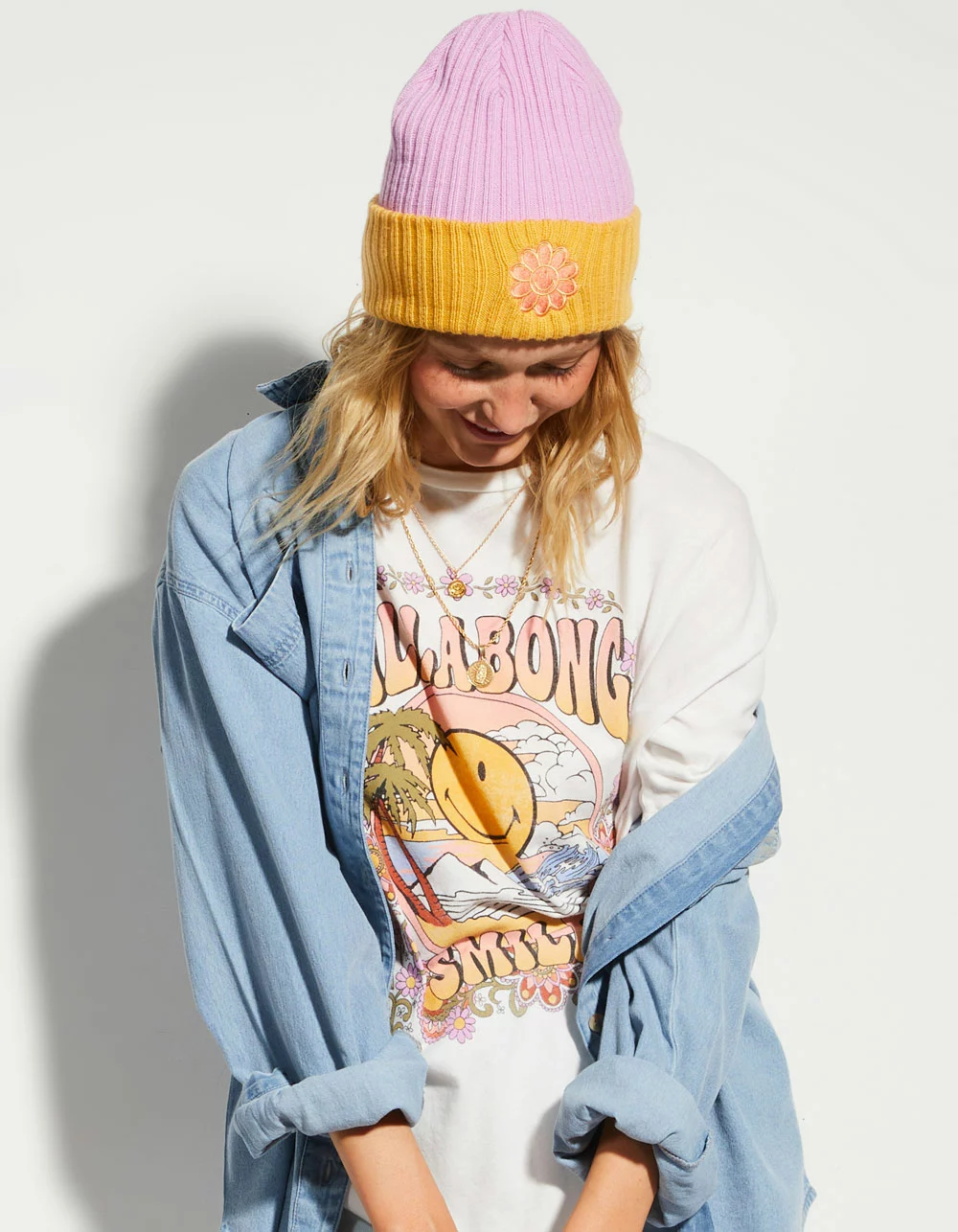 Billabong x Smiley Beanie. Made of chunky ribbed yarn, this Billabong X Smiley beanie has a slouchy two-tone design with an exclusive collection patch at the front. 60% Polyester, 40% Acrylic. Imported.