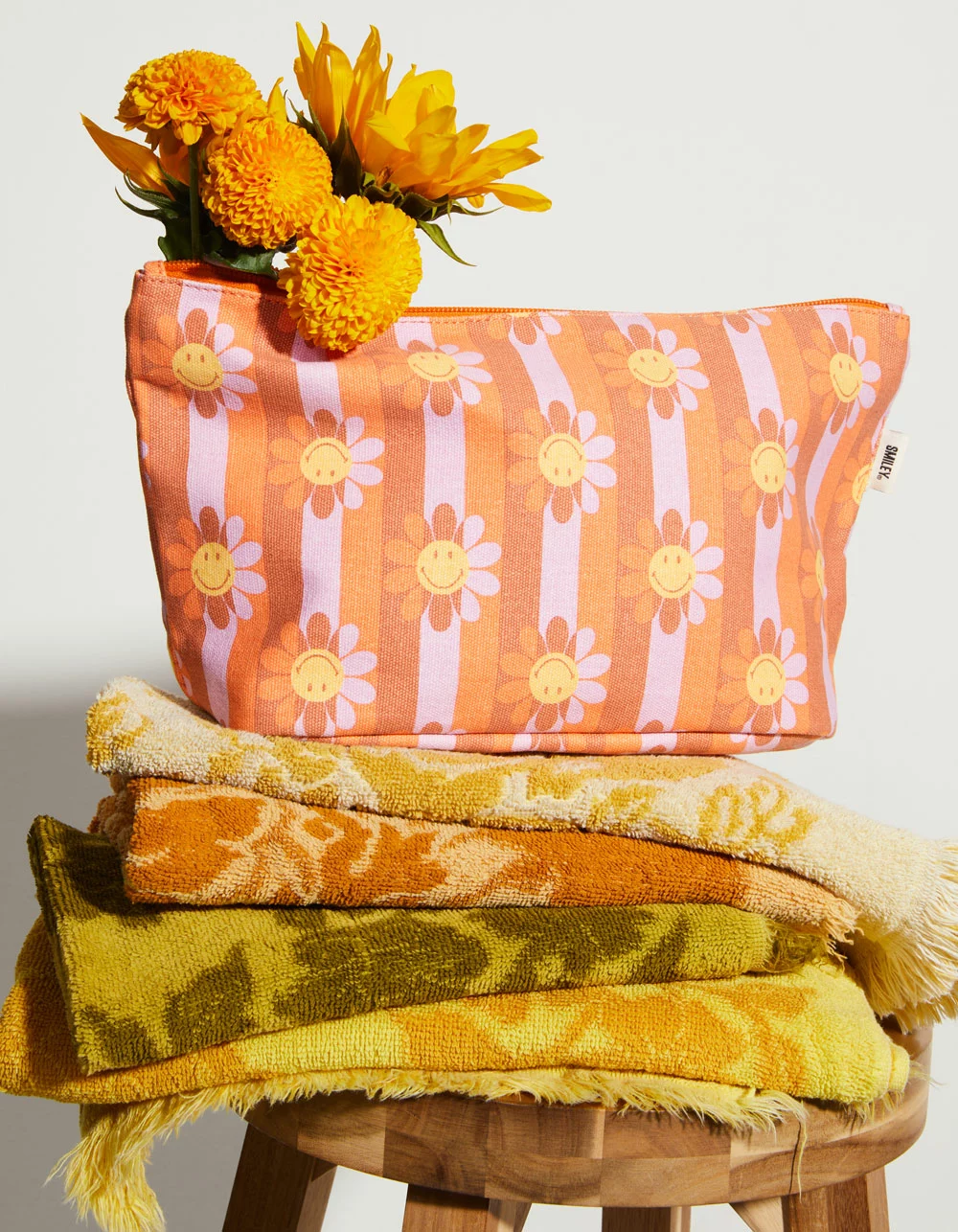 Billabong x Smiley Travel Pouch. Take the sunshine with you wherever you go. Zip pouch stores your makeup or daily essentials with a smile. Main zip compartment. Billabong X Smiley flag label. 100% Cotton. Imported.
